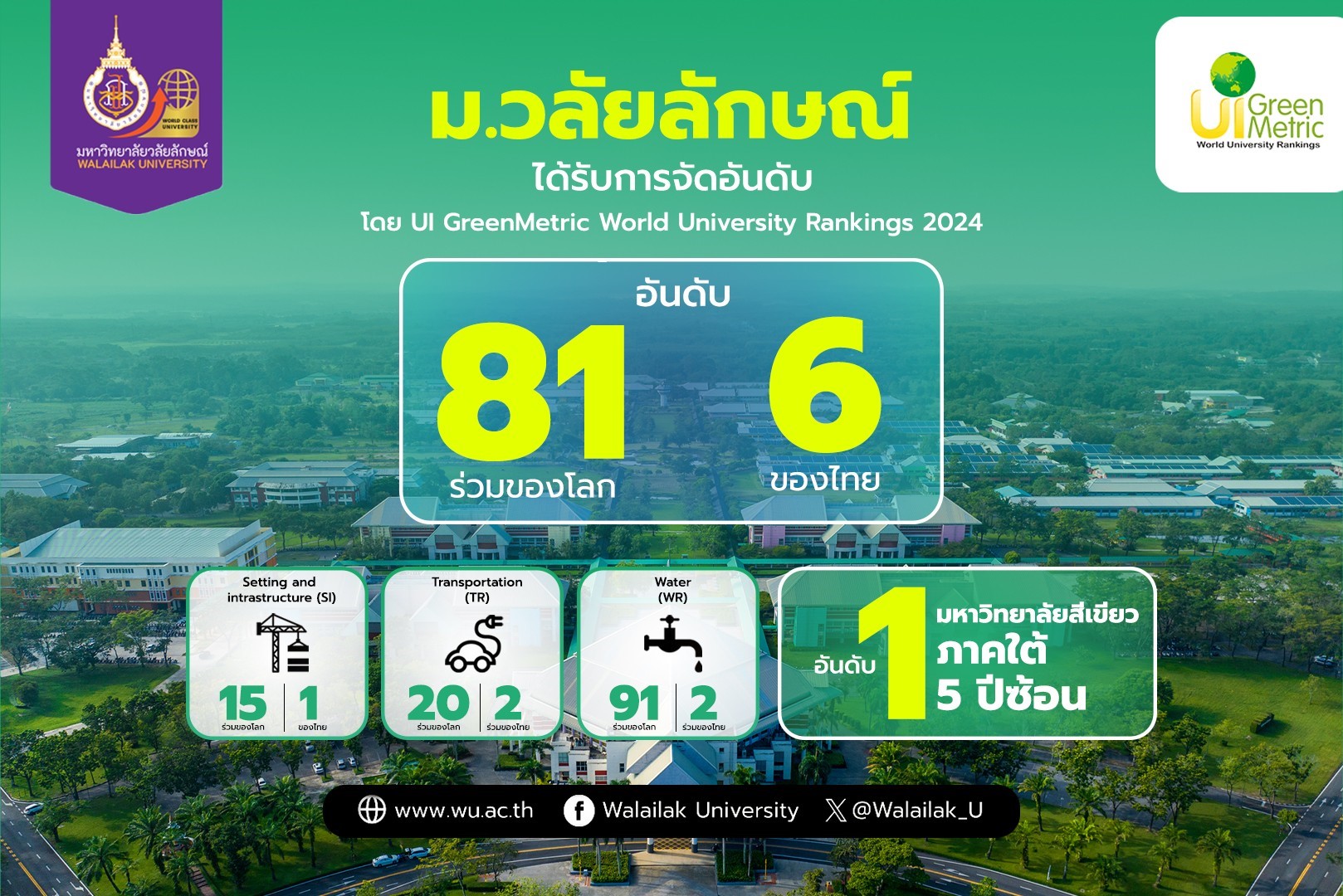 ล่าสุดในปี 2567 มหาวิทยาลัยวลัยลักษณ์ได้รับการจัดอันดับ UI GreenMetric World University Rankings อยู่ในอันดับที่ 81 ร่วมของโลก อันดับที่ 6 ของประเทศไทย และอันดับที่ 1 ของภาคใต้ 5 ปีซ้อน โดยมีผลคะแนนด้าน Setting and Infrastructure : SI อยู่ในอันดับที่ 1 ของประเทศไทย และอันดับ 15 ร่วมของโลกต่อเนื่องเป็นปีที่ 4