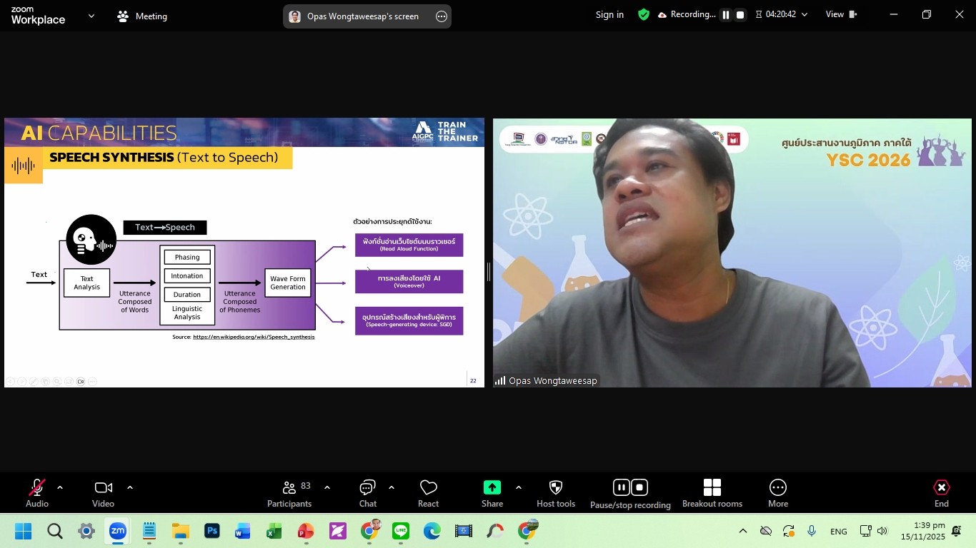ภายในกิจกรรมอบรมเสริมทักษะความรู้ ได้รับเกียรติจาก คุณสุนทรี กริชชัยศักดิ์ หัวหน้าโครงการ YSC จากสำนักงานพัฒนาวิทยาศาสตร์และเทคโนโลยีแห่งชาติ (สวทช.) และ ผศ.ดร.รุ่งเรือง จันทา หัวหน้าโครงการ YSC ศูนย์ประสานงานภูมิภาค ภาคใต้ ร่วมต้อนรับผู้เข้าร่วมกิจกรรมในครั้งนี้ โดยกิจกรรมจัดขึ้นในรูปแบบออนไลน์ ผ่านระบบ ZOOM MEETING และเปิดโอกาสให้ผู้สนใจทั่วไปสามารถเข้ารับความรู้ในครั้งนี้ กิจกรรมประกอบด้วย