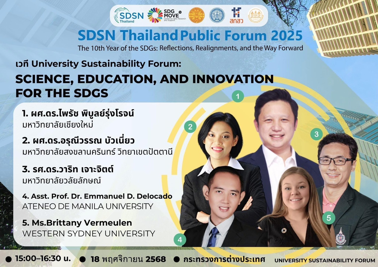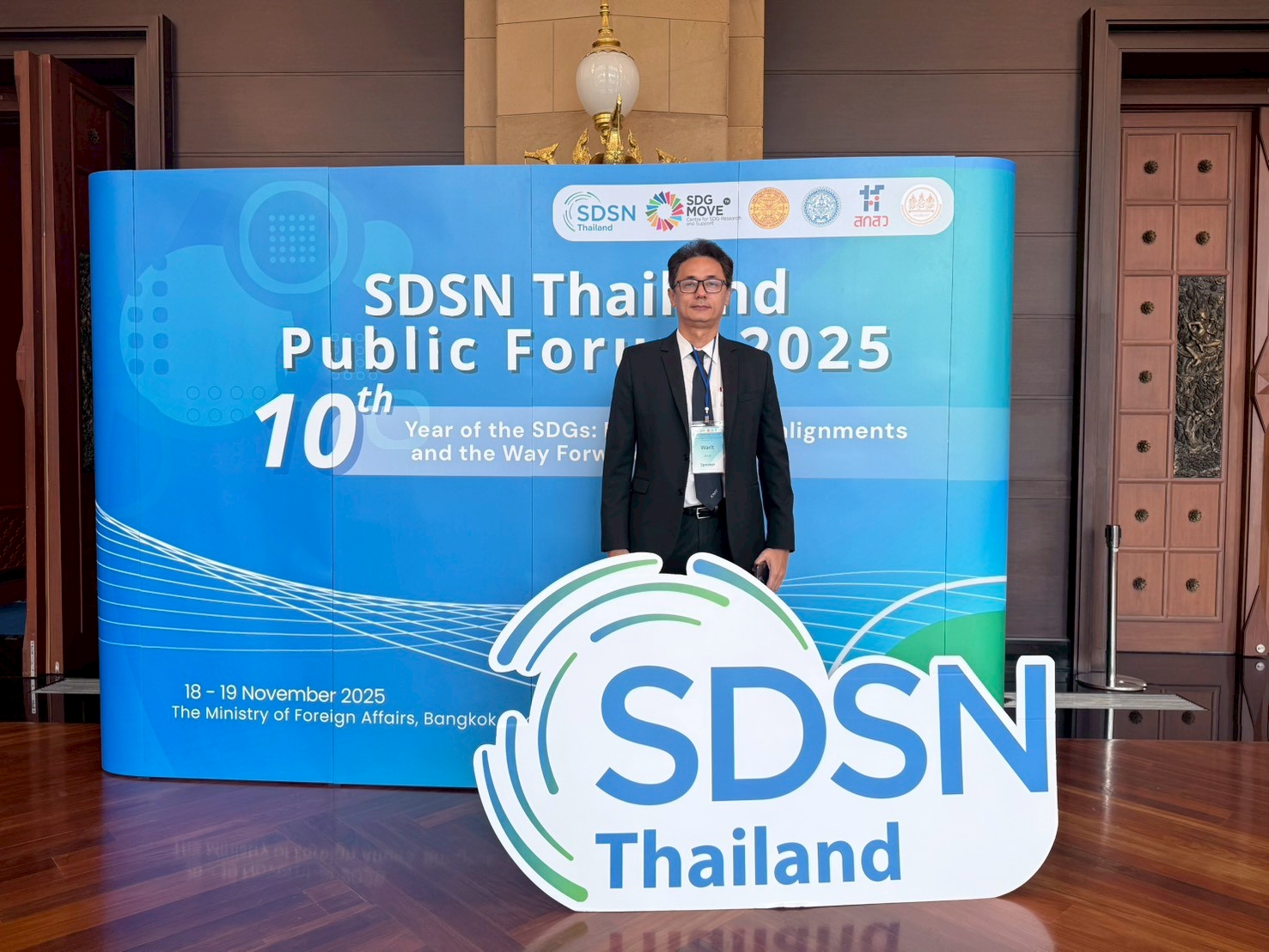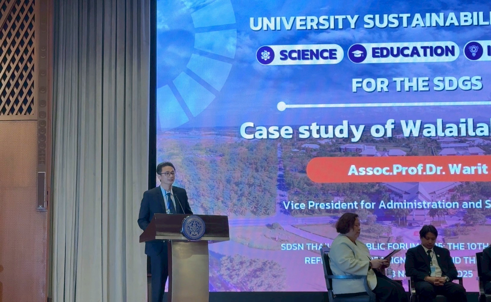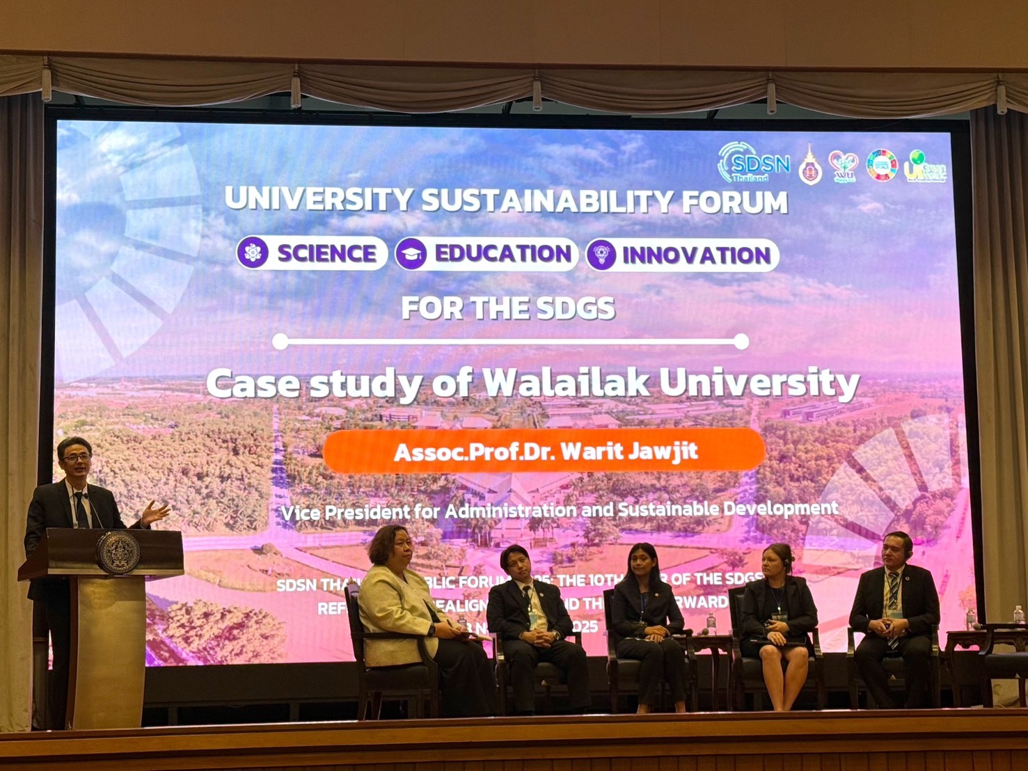 ระหว่างวันที่ 18 – 19 พฤศจิกายน พ.ศ. 2568 รองศาสตราจารย์ ดร.วาริท เจาะจิตต์ รองอธิการบดีฝ่ายบริหารและการพัฒนาอย่างยั่งยืน มหาวิทยาลัยวลัยลักษณ์ ได้รับเกียรติจาก เครือข่ายวิชาการเพื่อการพัฒนาที่ยั่งยืนของประเทศไทย – SDSN Thailand ให้เข้าร่วมเป็นวิทยากรบรรยายพิเศษ ในงาน “ร่วมเวทีประชุมวิชาการสาธารณะ SDSN Thailand Public Forum 2025 The 10th Year of the SDGs: Reflections, Realignments, and the Way Forward ครบรอบ 10 ปีเป้าหมายหมายพัฒนาที่ยั่งยืน: ทบทวน ปรับทิศทาง ก้าวต่อไป” ซึ่งจัดขึ้น ณ กระทรวงการต่างประเทศ โดยความร่วมมือของภาคีหลักที่เป็นผู้นำด้านการพัฒนาที่ยั่งยืนของประเทศไทย โดยมีเจ้าภาพหลัก ได้แก่ เครือข่ายวิชาการเพื่อการพัฒนาที่ยั่งยืนของประเทศไทย (SDSN Thailand) ศูนย์วิจัยและสนับสนุนเป้าหมายการพัฒนาที่ยั่งยืน (SDG Move) ร่วมกับพันธมิตรที่เป็นหน่วยงานหลักของประเทศในด้านการต่างประเทศ วิทยาศาสตร์ และนโยบายการพัฒนา ได้แก่ มหาวิทยาลัยธรรมศาสตร์ กระทรวงการต่างประเทศ สำนักงานคณะกรรมการส่งเสริมวิทยาศาสตร์ วิจัยและนวัตกรรม (สกสว.) และสำนักงานสภาพัฒนาการเศรษฐกิจและสังคมแห่งชาติ (สศช.)