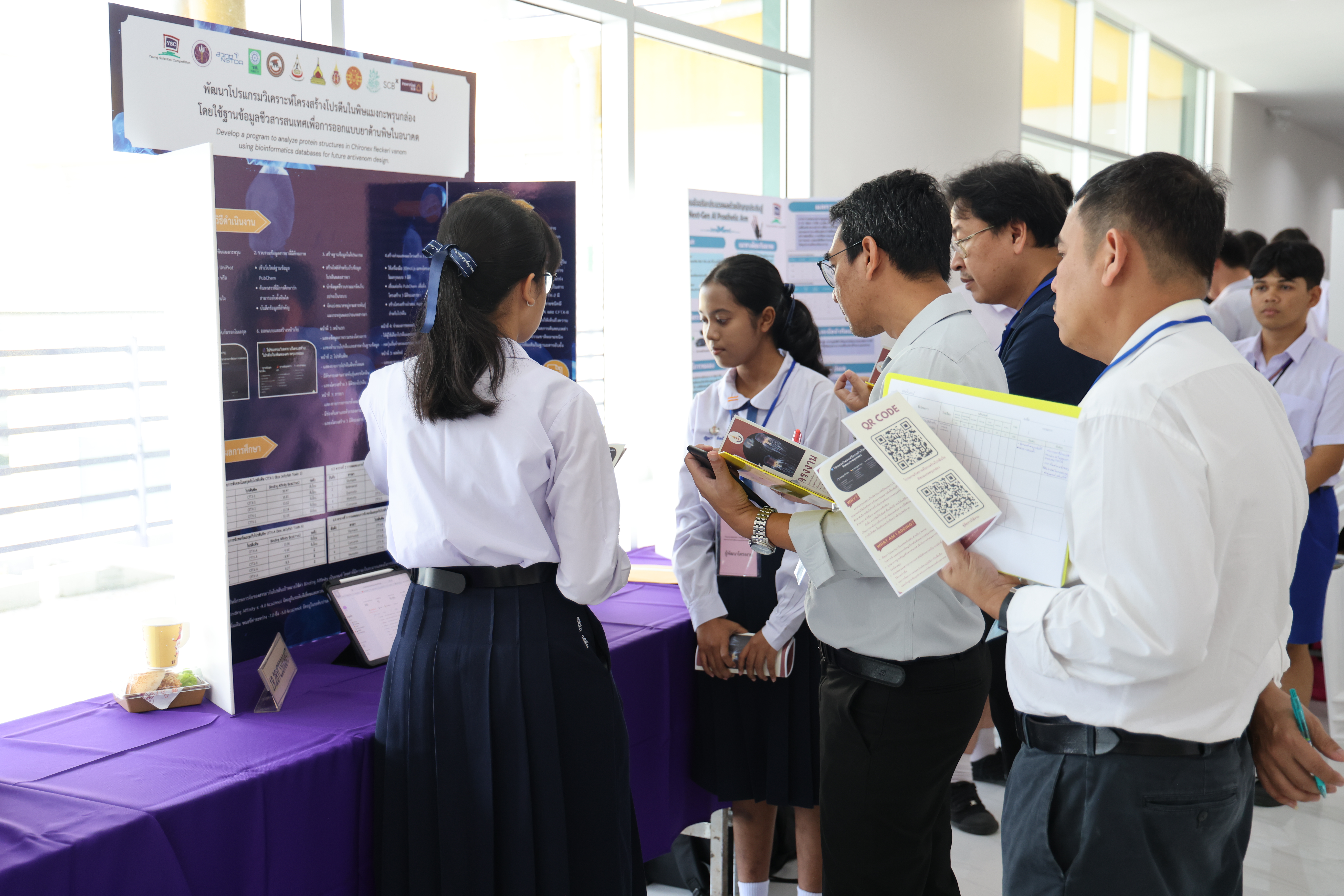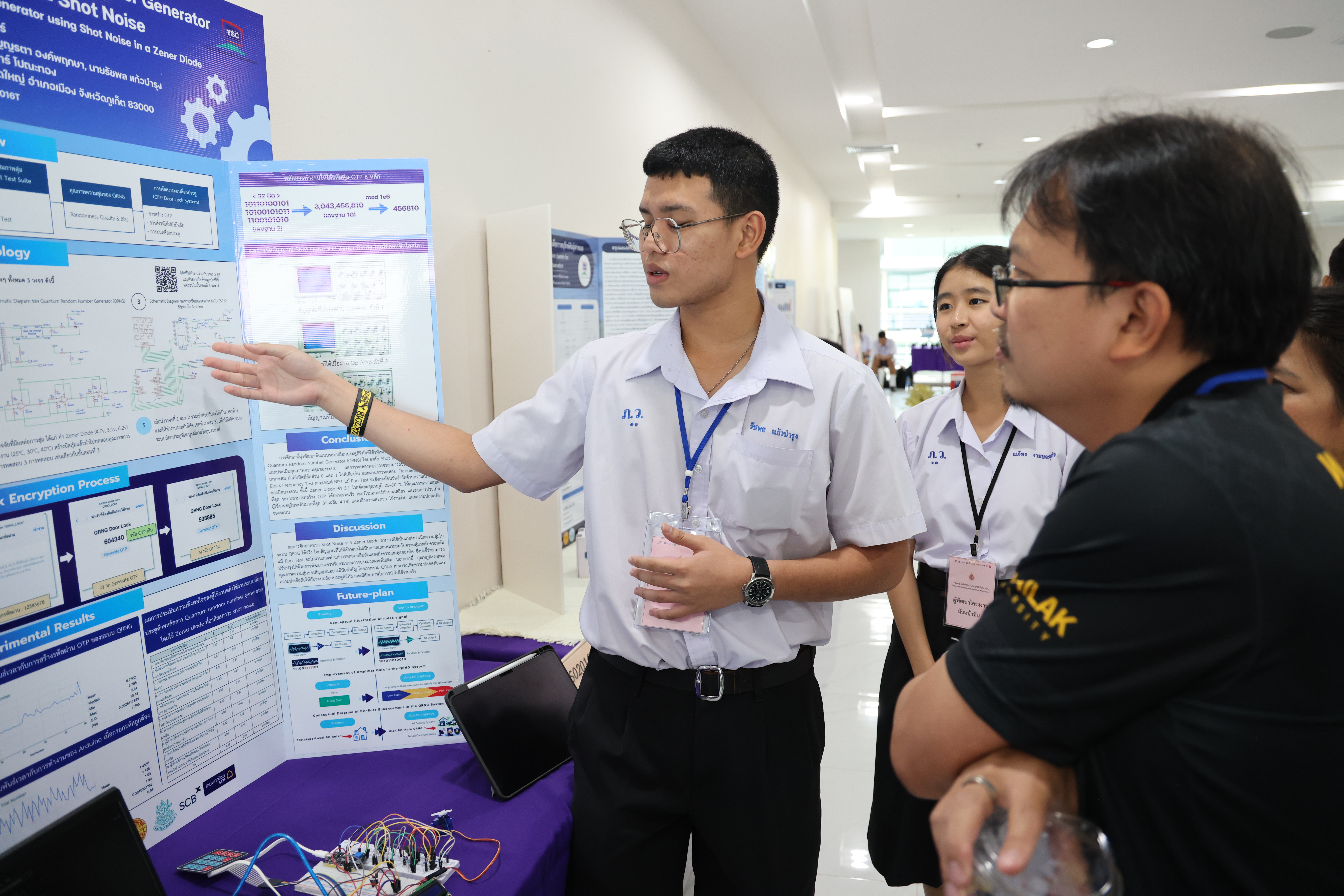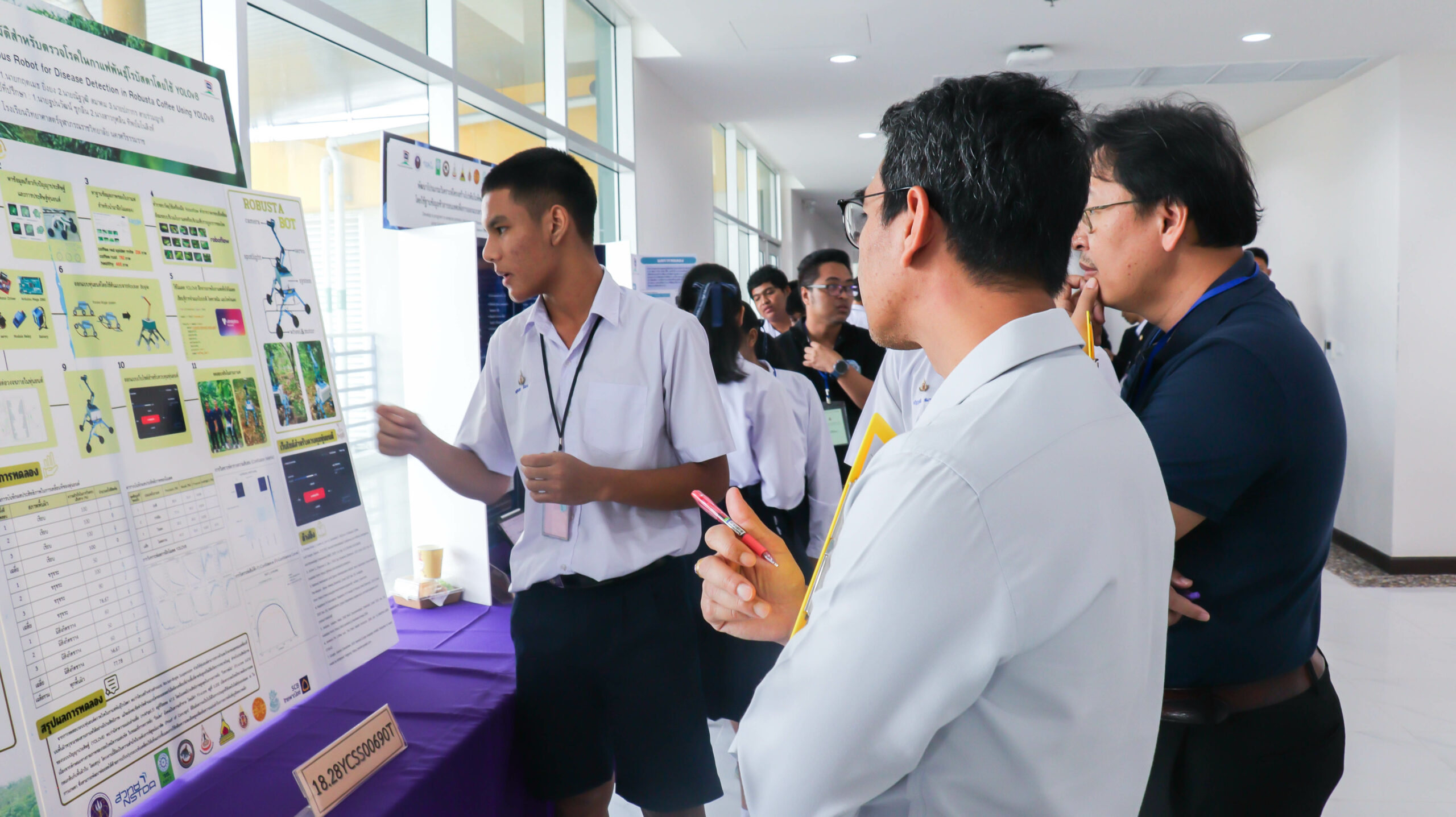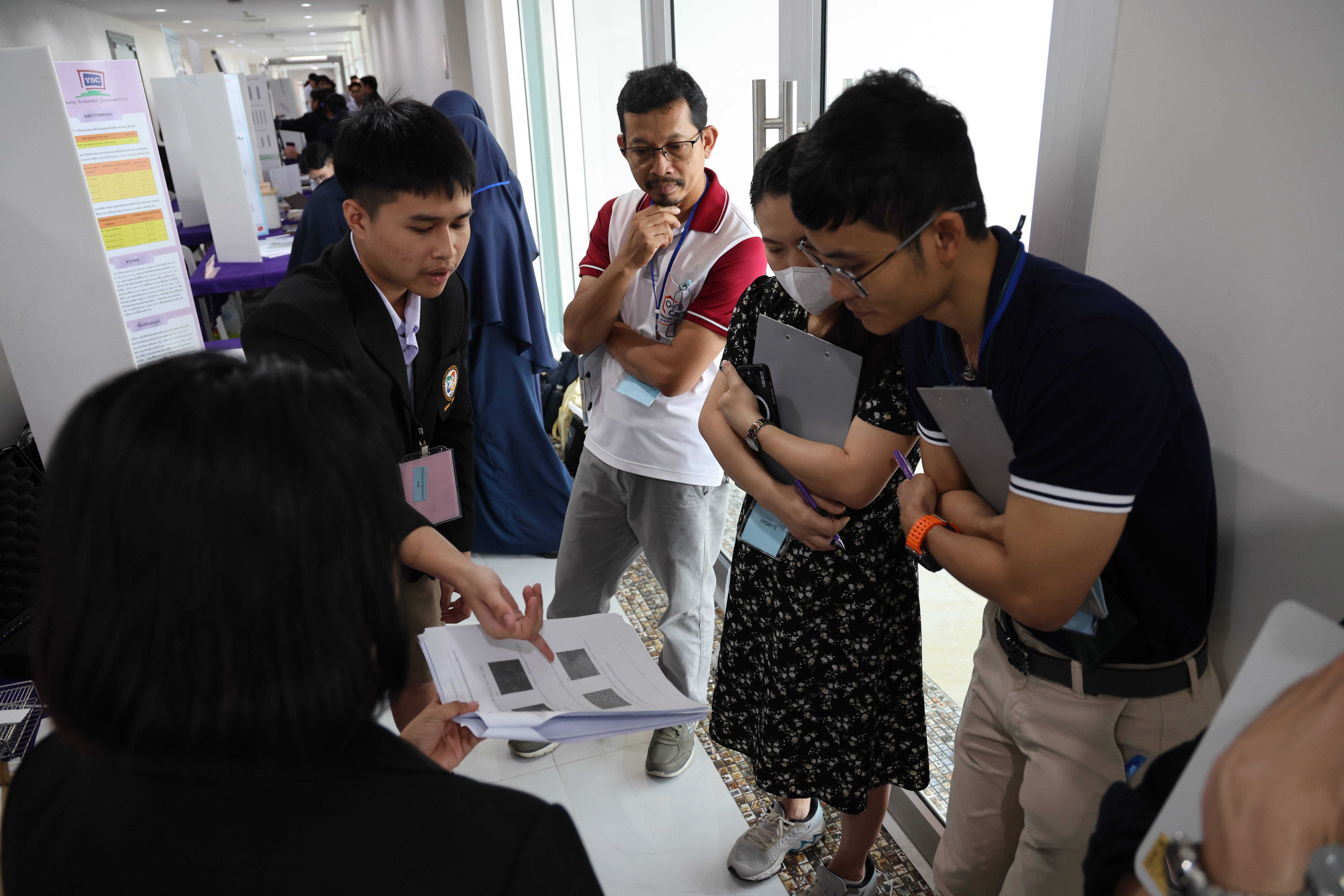 ในช่วงเช้า เวลา 09.00 – 12.00 น. ผู้พัฒนาโครงงานร่วมนำเสนอผลงาน โดยผ่านการนำเสนอผลงาน และตอบข้อซักถามจากคณะกรรมการฝ่ายตัดสินการประกวดโครงงานจากมหาวิทยาลัยวลัยลักษณ์ จำนวน 35 ท่าน ประกอบด้วยสาขา  9 สาขา โดยมีโครงงานที่ผ่านการคัดเลือกเพื่อรับทุนสนับสนุนจำนวน 44 โครงงาน จาก 9 สาขา และจาก 18 โรงเรียนทั่วภาคใต้