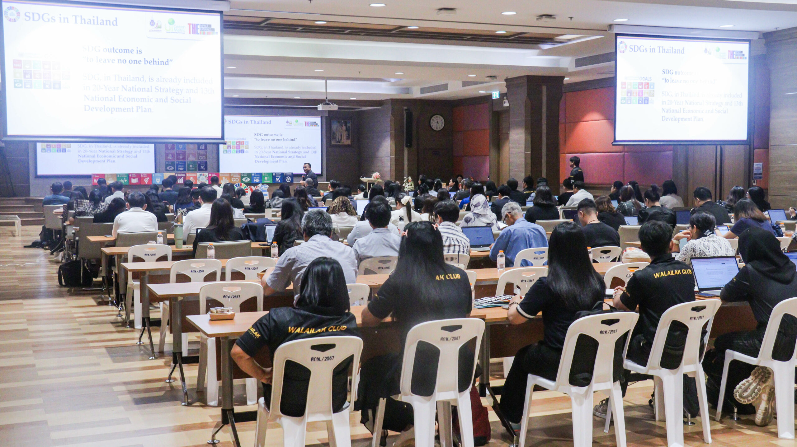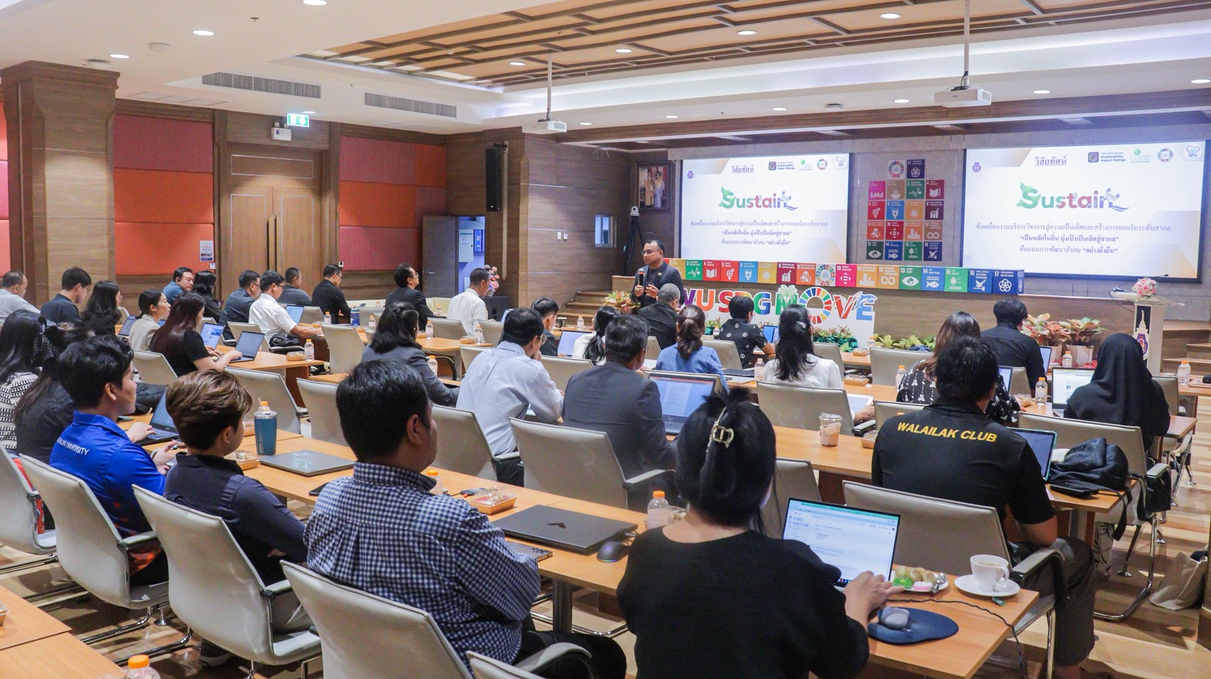 ทั้งนี้ ผู้ช่วยศาสตราจารย์ ดร.อมรศักดิ์ สวัสดี ผู้อำนวยการศูนย์บริการวิชาการ กล่าวชี้แจงแนวทางการทำงานเพื่อตอบโจทย์ SDGs มหาวิทยาลัยวลัยลักษณ์กับเป้าหมายการพัฒนาที่ยั่งยืนและแนวทางการดำเนินโครงการ และเกณฑ์การคิดคะแนนภาระงานโครงการที่เกี่ยวข้องกับ SDGs กิจกรรมดังกล่าวมีวัตถุประสงค์การจัดงานเพื่อให้ผู้เข้ารับการอบรมเข้าใจกระบวนการดำเนินงานและเตรียมความพร้อมในการจัดอันดับการดำเนินงานโครงการตามเป้าหมายการพัฒนาอย่างยั่งยืน (THE Sustainability Impact Ratings) โดยมีผู้คณาจารย์และผู้แทน เข้าร่วมกิจกรรม 141 คน รวมจำนวน 91 โครงการ ครอบคลุมทุกสำนักวิชา/วิทยาลัย