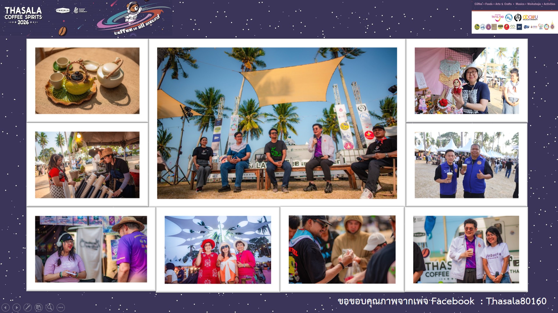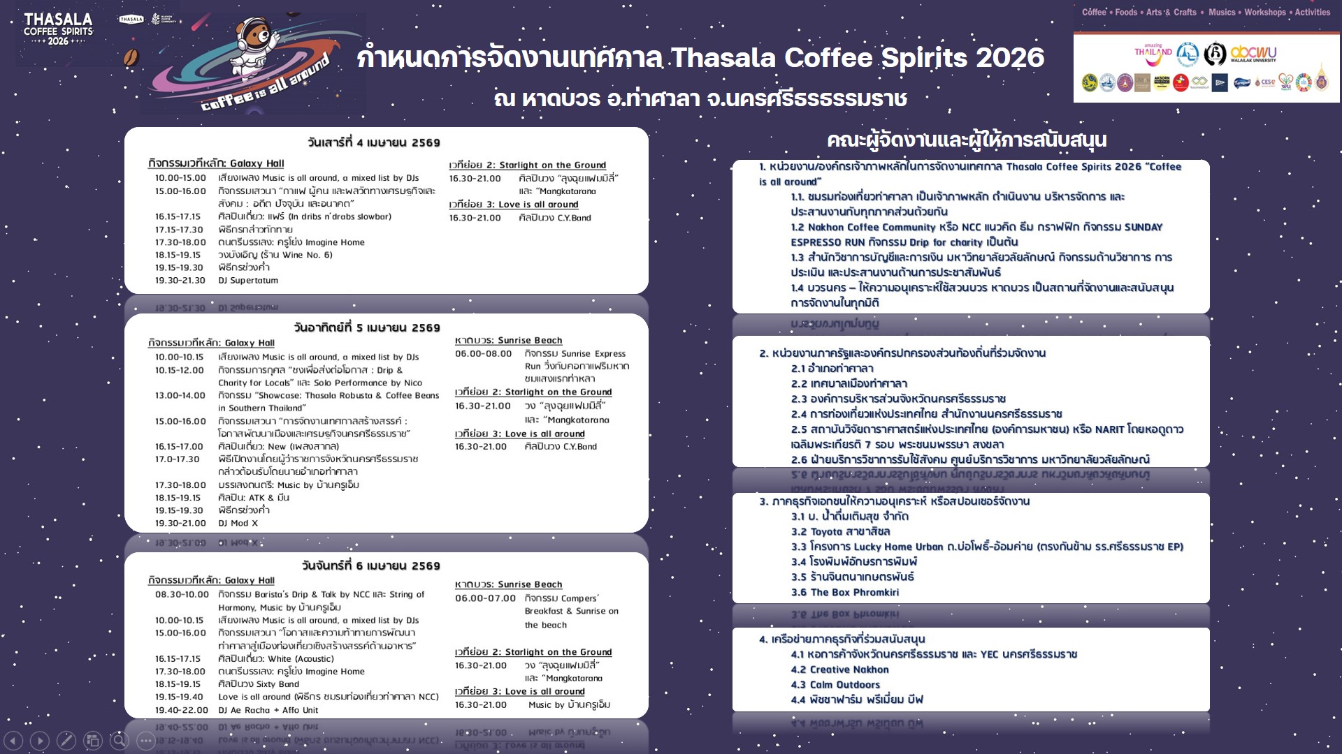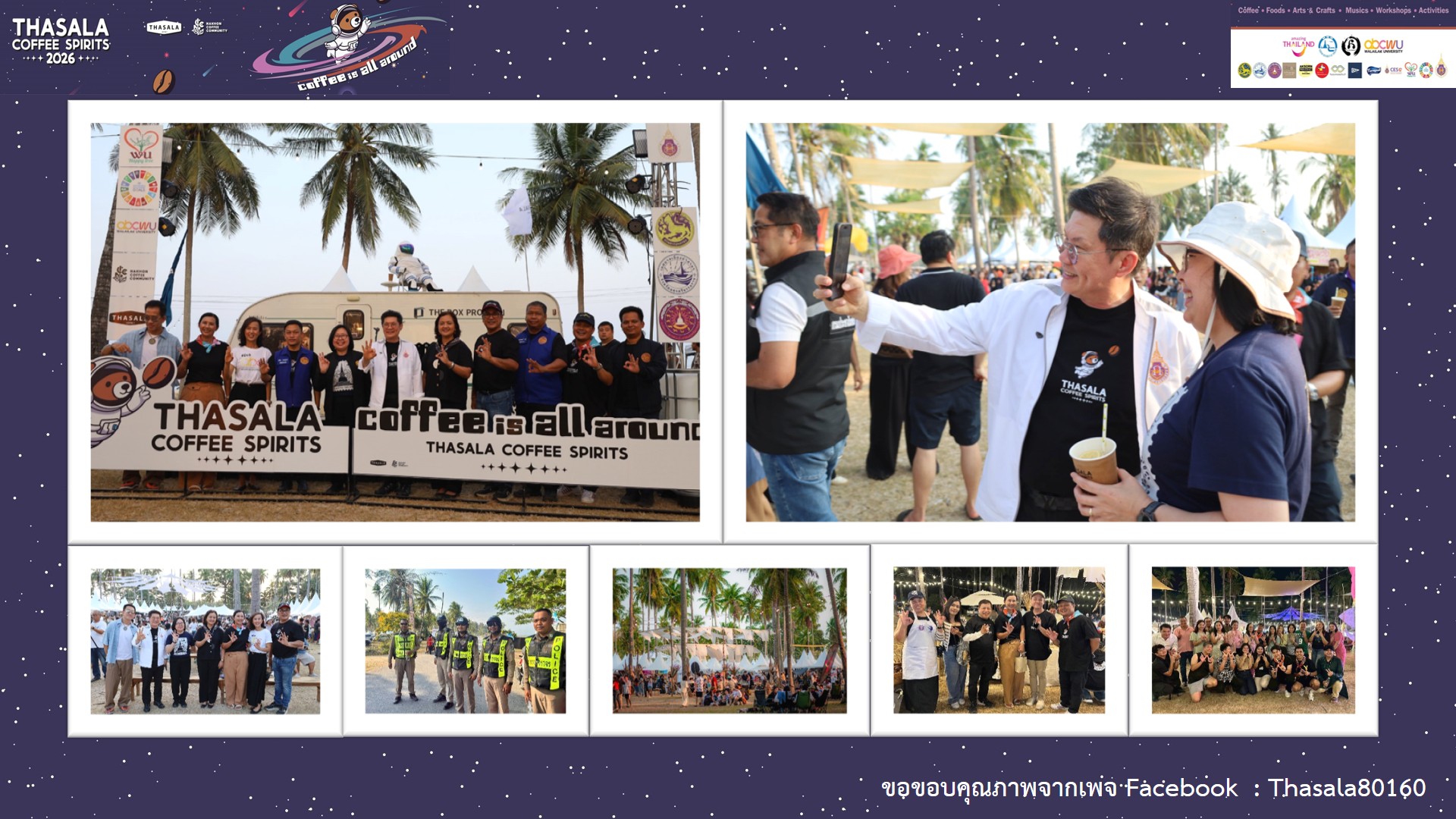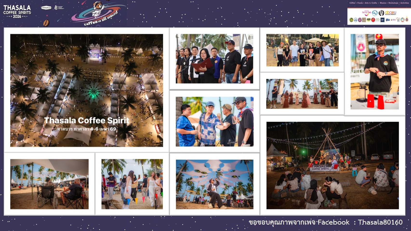 ปิดฉากลงอย่างสวยงามสำหรับเทศกาลกาแฟสุดยิ่งใหญ่แห่งปี “Thasala Coffee Spirits 2026” ภายใต้แนวคิด “Coffee is all around” ซึ่งจัดขึ้นระหว่างวันที่ 4-6 เมษายน 2569 ณ หาดบวร อำเภอท่าศาลา จังหวัดนครศรีธรรมราช โดยความร่วมมืออย่างแข็งแกร่งของชมรมท่องเที่ยวท่าศาลา, Nakhon Coffee Community และภาคีเครือข่าย โดยเฉพาะบทบาทของมหาวิทยาลัยวลัยลักษณ์ ในการสนับสนุนด้านวิชาการและการประเมินผลสัมฤทธิ์ของงาน สำหรับพิธีเปิดอย่างเป็นทางการจัดขึ้นเมื่อวันที่ 5 เมษายน 2569 เวลา 18.00 น. นางวจิราพร อมาตยกุล รองผู้ว่าราชการจังหวัดนครศรีธรรมราช ได้รับมอบหมายจากผู้ว่าราชการจังหวัดให้เป็นประธานในพิธีเปิดงาน “Thasala Coffee Spirits 2026” โดยมีตัวแทนจากหน่วยงานภาครัฐ ภาคเอกชน และสถาบันการศึกษาเข้าร่วมงานอย่างคับคั่ง จากการประเมินผลอย่างเป็นทางการพบว่าได้รับกระแสตอบรับเกินความคาดหมาย ตอกย้ำศักยภาพของจังหวัดในการเป็นจุดหมายปลายทางของการท่องเที่ยวเชิงสร้างสรรค์