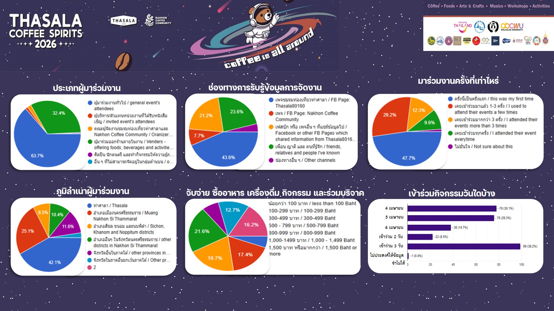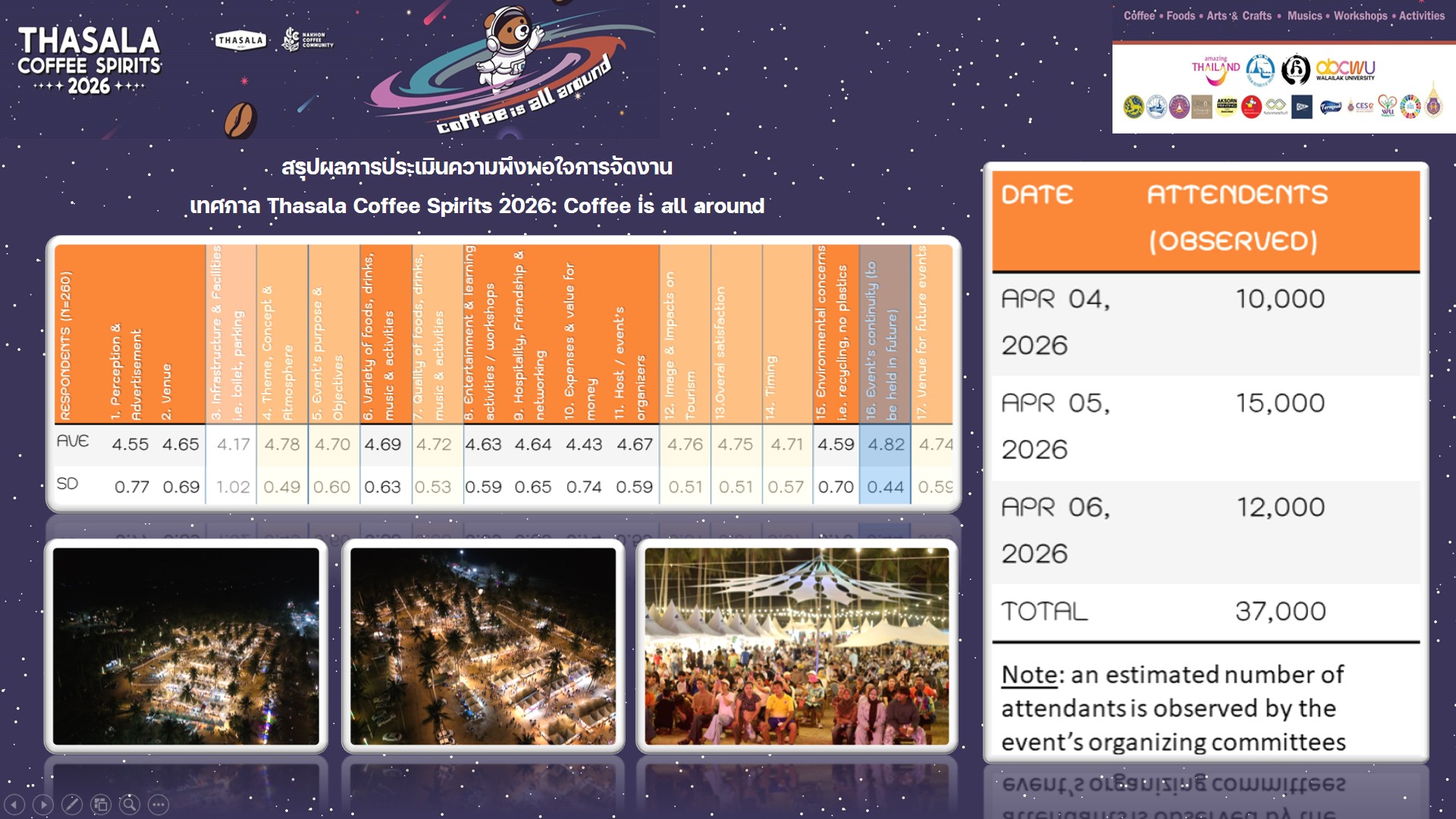 2) ธีมและบรรยากาศการจัดงาน (4.78) พบว่าบรรยากาศริมหาดบวรและการตกแต่งในสไตล์อวกาศ “Coffee is all around” สร้างความประทับใจในระดับสูง