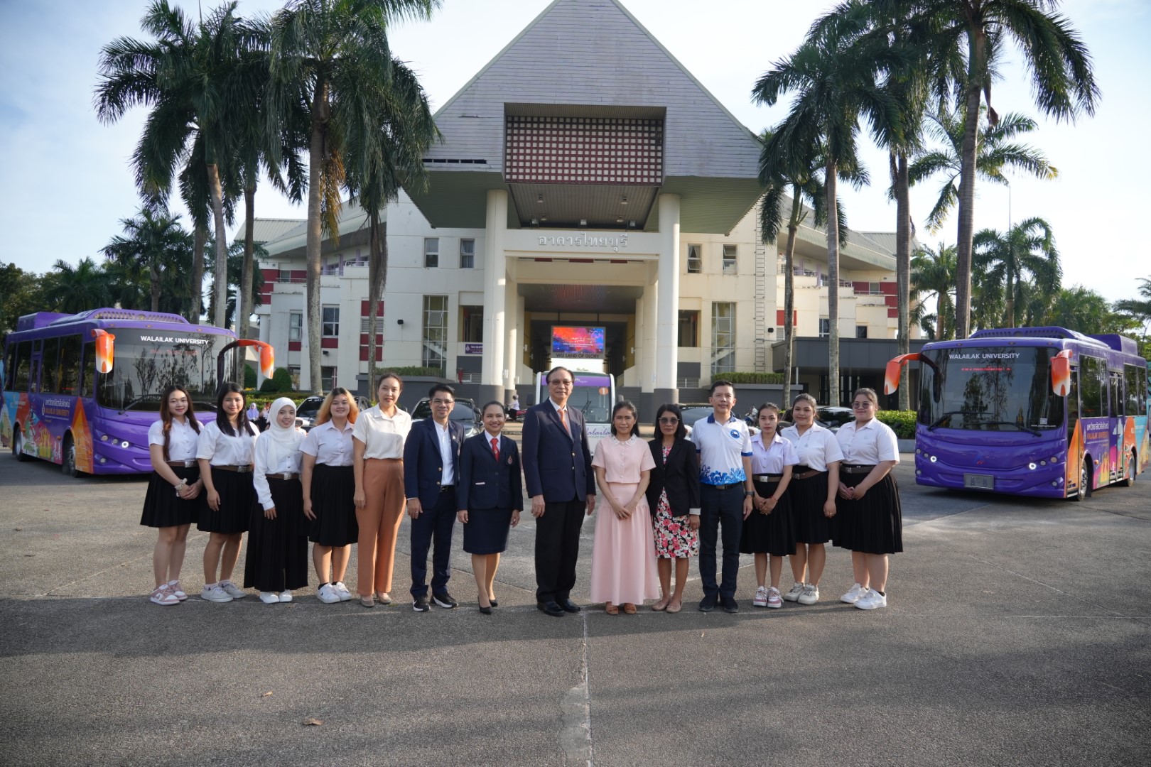 On February 13, 2025, Prof. Dr. Sombat Thamrongthanyawong, President of Walailak University, presided over the launch of the university’s eco-friendly internal transportation system, which includes 9 electric buses, 8 electric cars, 30 electric motorcycles, and 1 electric tram. The initiative aims to support various university operations while encouraging students and staff to adopt environmentally friendly transportation, advancing Walailak University toward becoming a full-fledged Green University. The event was attended by university executives, faculty members, and students at Lan Phlenta, in front of the Thaiburi Building.