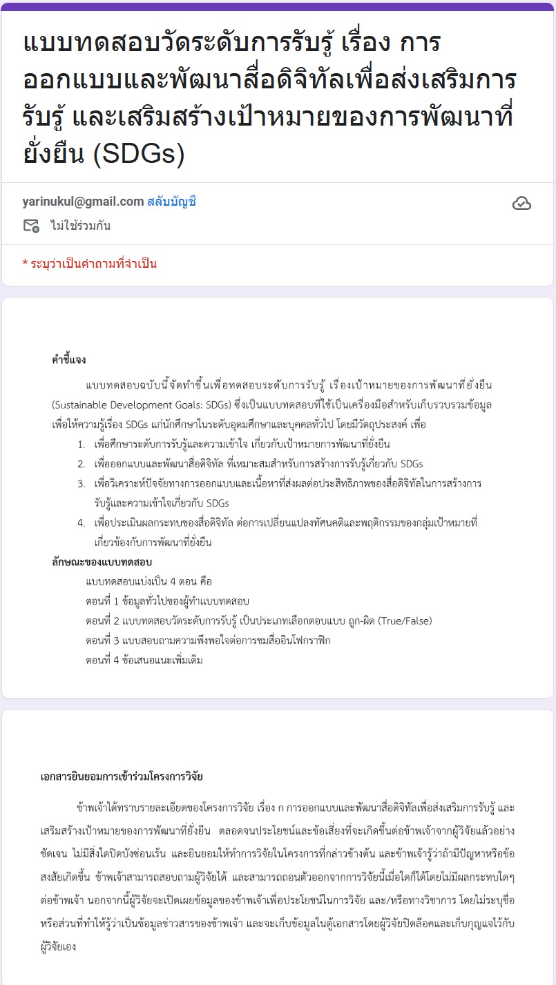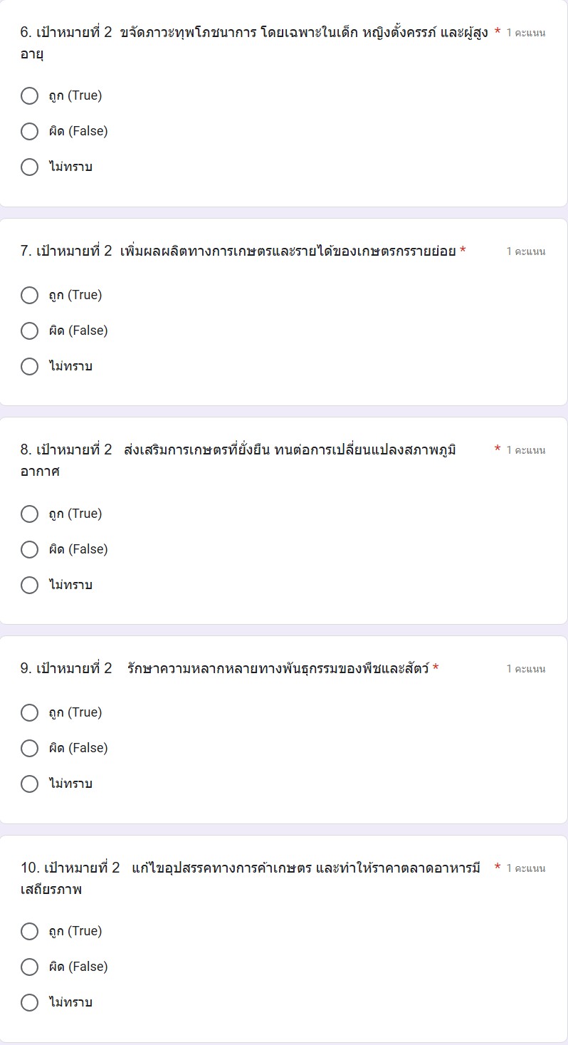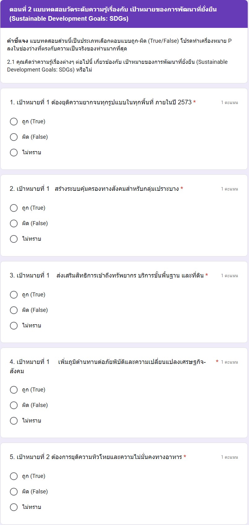 On 30 September 2025, Walailak University (WU) developed a Google Form-based assessment to evaluate students’ understanding of the Sustainable Development Goals on the ability to learn and retain key concepts of sustainability as part of the indicators for the Times Higher Education (THE) Impact Rankings. The assessment consists of 30 questions, covering all 17 SDGs, with varying levels of difficulty. It is administered to all WU students to measure their foundational knowledge and awareness of global sustainability issues.