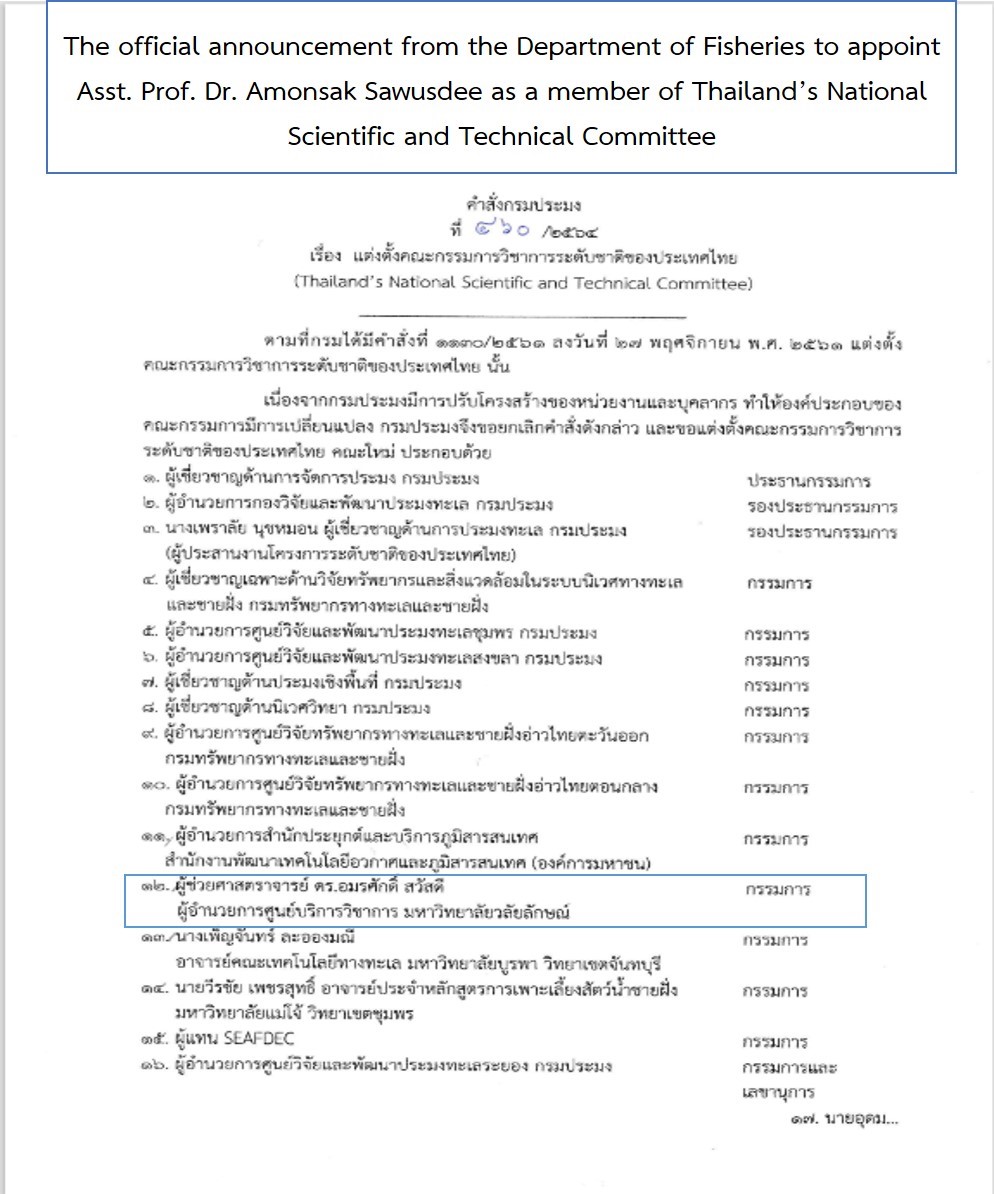 In addition, Asst. Prof. Dr. Amonsak Sawusdee has been appointed by the Department of Fisheries to become a member of three national committees that are still working on Thai fishery improvement towards sustainability. The committees include: