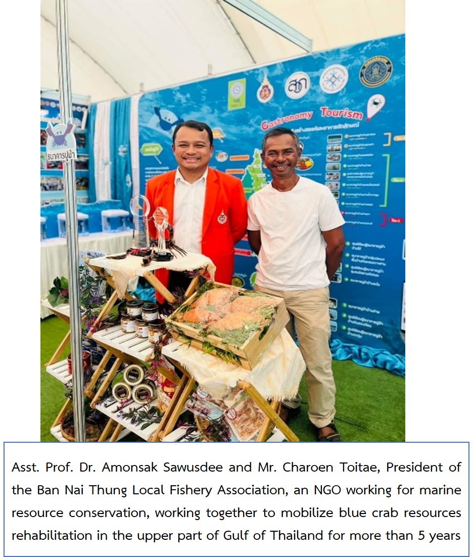 In addition, Asst. Prof. Dr. Amonsak Sawusdee, as a member of the Site-Based Fishery Refugia Management Board in Surat Thani Province, has been working with the Department of Fisheries on a program to set guidelines and comparative approaches to restoring resources and upgrading the blue crab fishery to meet international standards. The program is called “Fishery Improvement Program: FIP” and operates in Ban Don Bay, Surat Thani. For the program, Asst. Prof. Dr. Amonsak Sawusdee, as a member of the national committee, is responsible for developing strategies to reduce the impacts of overfishing, including: