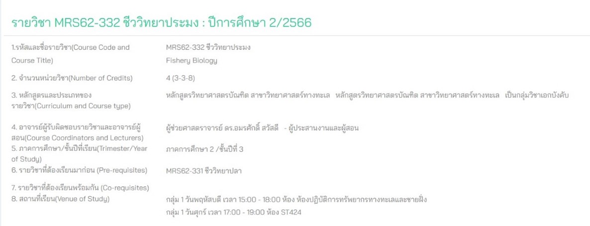 Figures : A subject titled “MRS62 332 Fishery Biology” in the WU TQF System and a list of SDGs that WU lecturers must specify as being integrated into their subjects