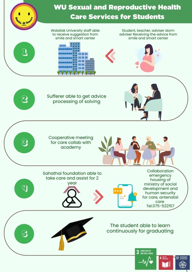 Walailak University has established the Smile & Smart Center in collaboration with various organizations, such as Tha Sala Hospital, Walailak University Medical Center Hospital, and Sahathai Foundation, to provide students access to sexual and reproductive health-care services including information and education services. This center not only offers free counseling and information but also helps students facing sexual health issues access services more easily through both online and on-site platforms.