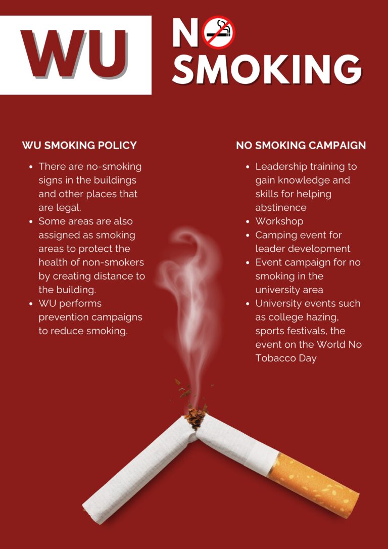 In 2022, Walailak University issued the announcement of Walailak University Subject : Policy to Protect Nonsmokers’ Health and Designate Specific Smoking Areas, B.E. 2565 (2022). Initially, the university adhered to national policies for tobacco control. Then, this active policy was reviewed in 2022 and subsequently updated in 2024 to include topics related to electronic cigarettes and cannabis. The objective of this policy is to raise awareness among students and staff about the impacts of smoking.