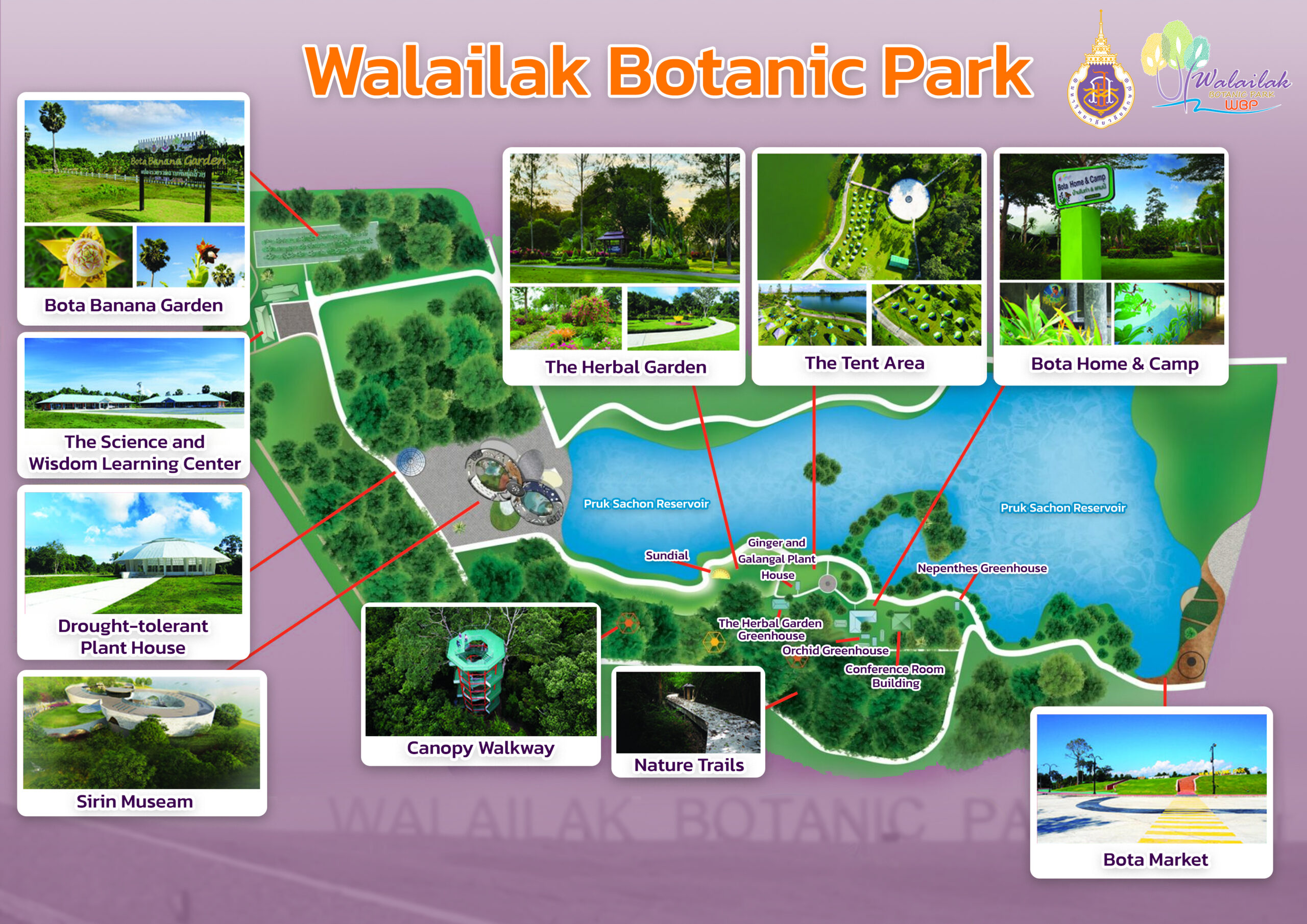 The park showcased the new global plant species in Nepenthes greenhouse, BOTA Cactus Dome, and maintains over 100 rare banana species. Walailak Botanic Park also comprises the following main areas: