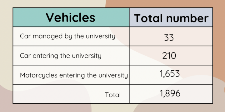 In 2024, Walailak University has a total population of 15,860 people, comprising 13,277 students and 2,583 staff members. Therefore, in 2024, the university’s ratio of fuel-powered vehicles to the total population is 0.11%.