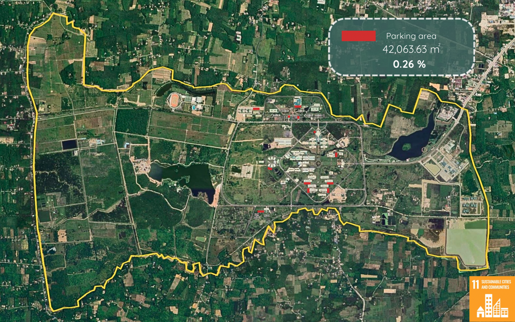The university has a total area of 15,350,400 square meters, with a total parking area of 40,063.63 square meters.This means that the ratio of parking space to the total area of the university is approximately 0.26 %.