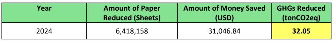 – Greenhouse Gases (GHGs) Reduced: The reduction in paper usage resulted in the mitigation of 32.05 tons of CO₂ equivalent (tonCO₂eq) emissions