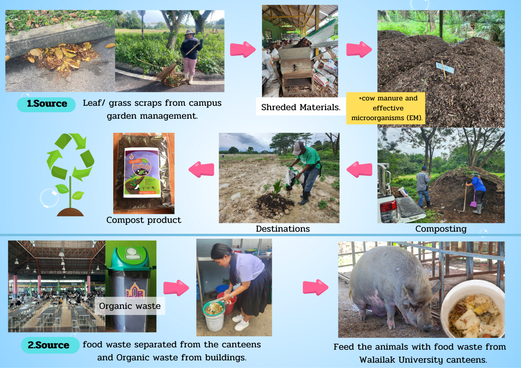 Walailak University has implemented a holistic organic waste management system, including on-campus sorting, composting, and repurposing waste as animal feed. The system emphasizes separating organic waste at the source. Composting transforms leaves and food scraps into valuable compost for campus greenery, reducing fertilizer costs. Additionally, food waste is used as animal feed on the university’s farm, cutting waste and costs. These efforts will reduce greenhouse gas emissions by 216.1 tonCO2eq in 2024, demonstrating the university’s commitment to sustainability.