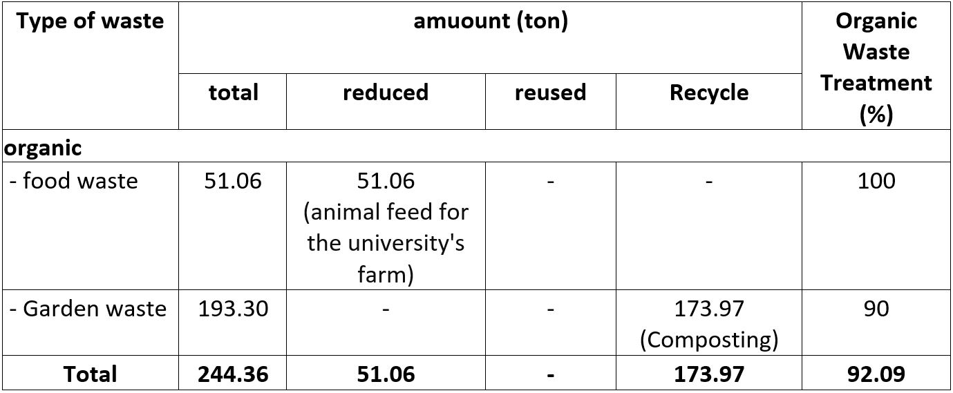 By treating and utilizing 92.09% of the organic waste generated, Walailak University adheres to best practices in organic waste management as recommended by UI GreenMetric guidelines. The university’s system of reducing, reusing, and recycling organic waste demonstrates a comprehensive strategy aimed at environmental sustainability, minimizing the ecological impact of waste, and contributing to the university’s green campus initiatives. This integrated approach aligns with global sustainability goals, such as SDG 12 (Responsible Consumption and Production) and SDG 13 (Climate Action), by reducing waste, lowering carbon emissions, and enhancing the resilience of campus operations.