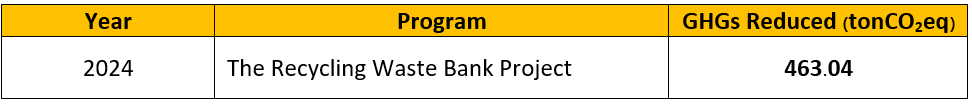 In 2024, the separation of recyclable waste such as paper, plastic, and metal through the Waste Bank project not only helped reduce the amount of waste entering the university’s waste management system but also generated income for staff and students involved in the project. Moreover, this recycling activity contributed to a reduction in greenhouse gas emissions equivalent to 463.04 tonCO2eq. (based on US EPA’s Waste Reduction Model Version 15 (May 2019) (paper, plastic, metal))