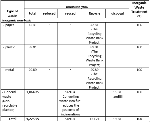 All the inorganic waste (100%) was treated by Converting waste into fuel reduced the gas costs of incineration in the university incinerator and landfill. The rest was recycled.