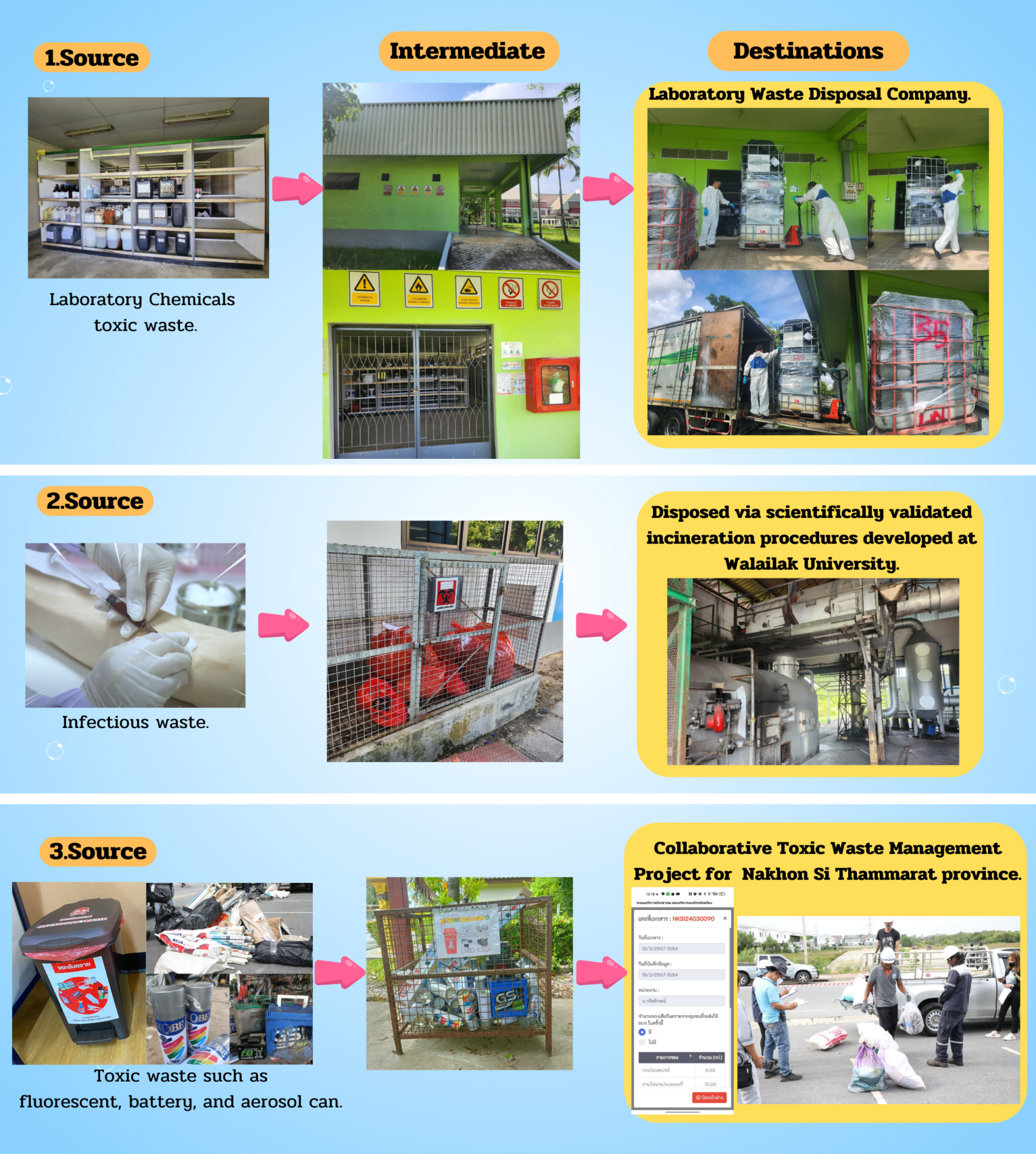 A total of 48.87 tons of toxic waste is treated each year at Walailak University, utilizing specialized disposal methods to minimize environmental impact and adhere to safety regulations.