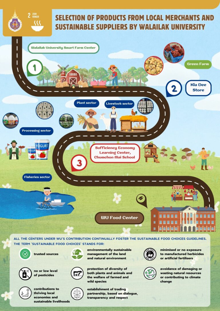 Food sustainability in the context of Walailak University is closely connected to sourcing safe and sustainable food from local communities. The university prioritizes purchasing from sustainable food source which is environmentally sustainable management of the land and natural environment. Also, it is from environmentally friendly and sustainable production sources, such as using seasonal ingredients to reduce the environmental impact of transportation. Additionally, the university supports restaurants and products that focus on minimizing food waste, aligning with the sustainable development goals of responsible consumption and the sustainable management of food resources.