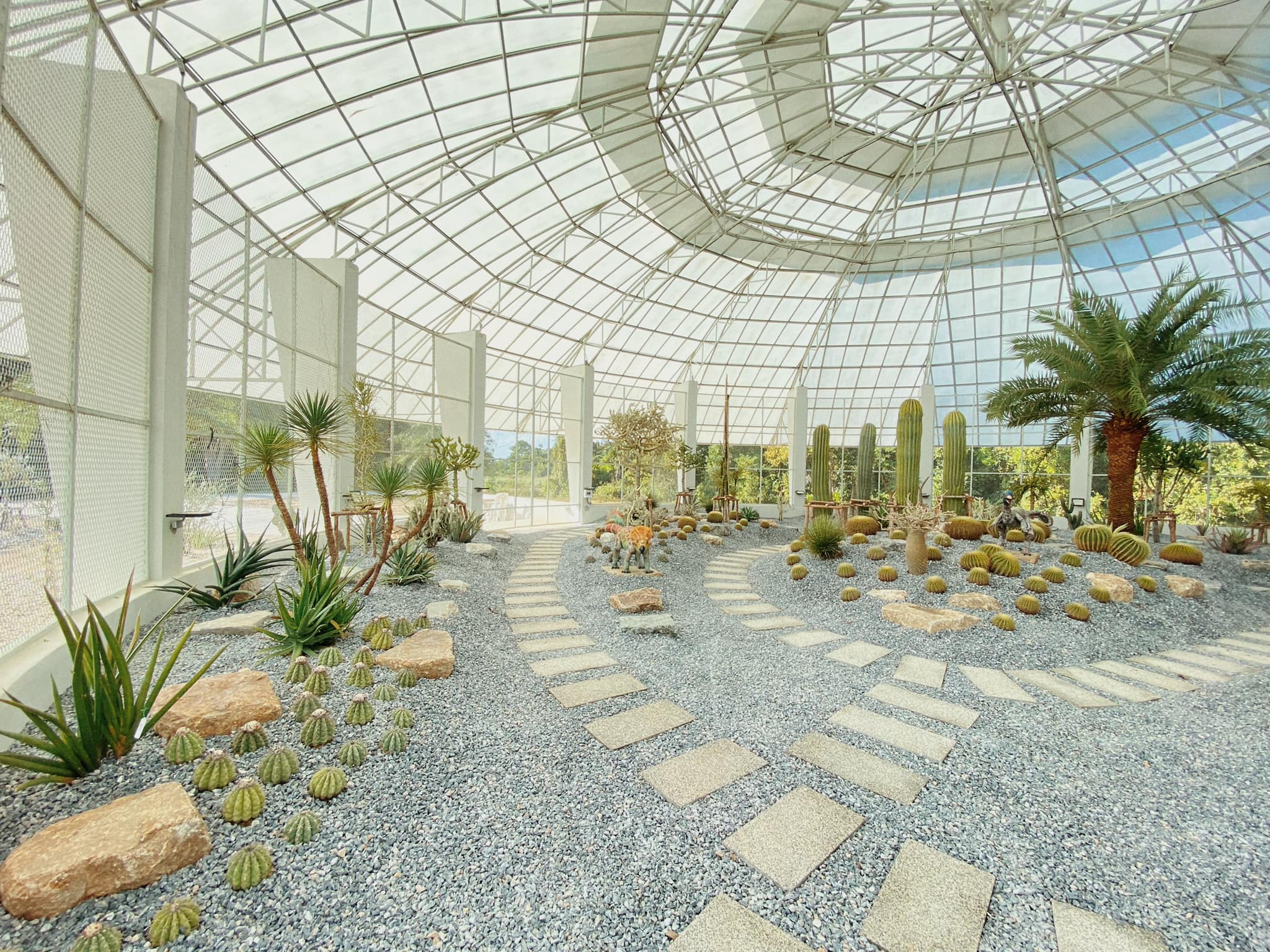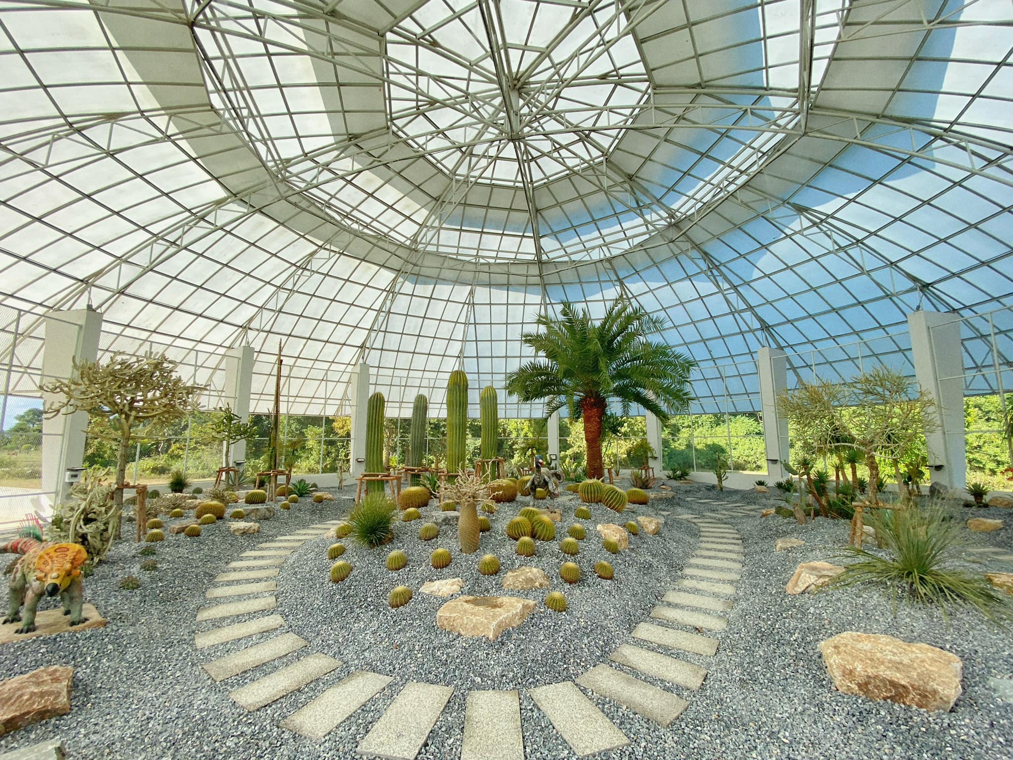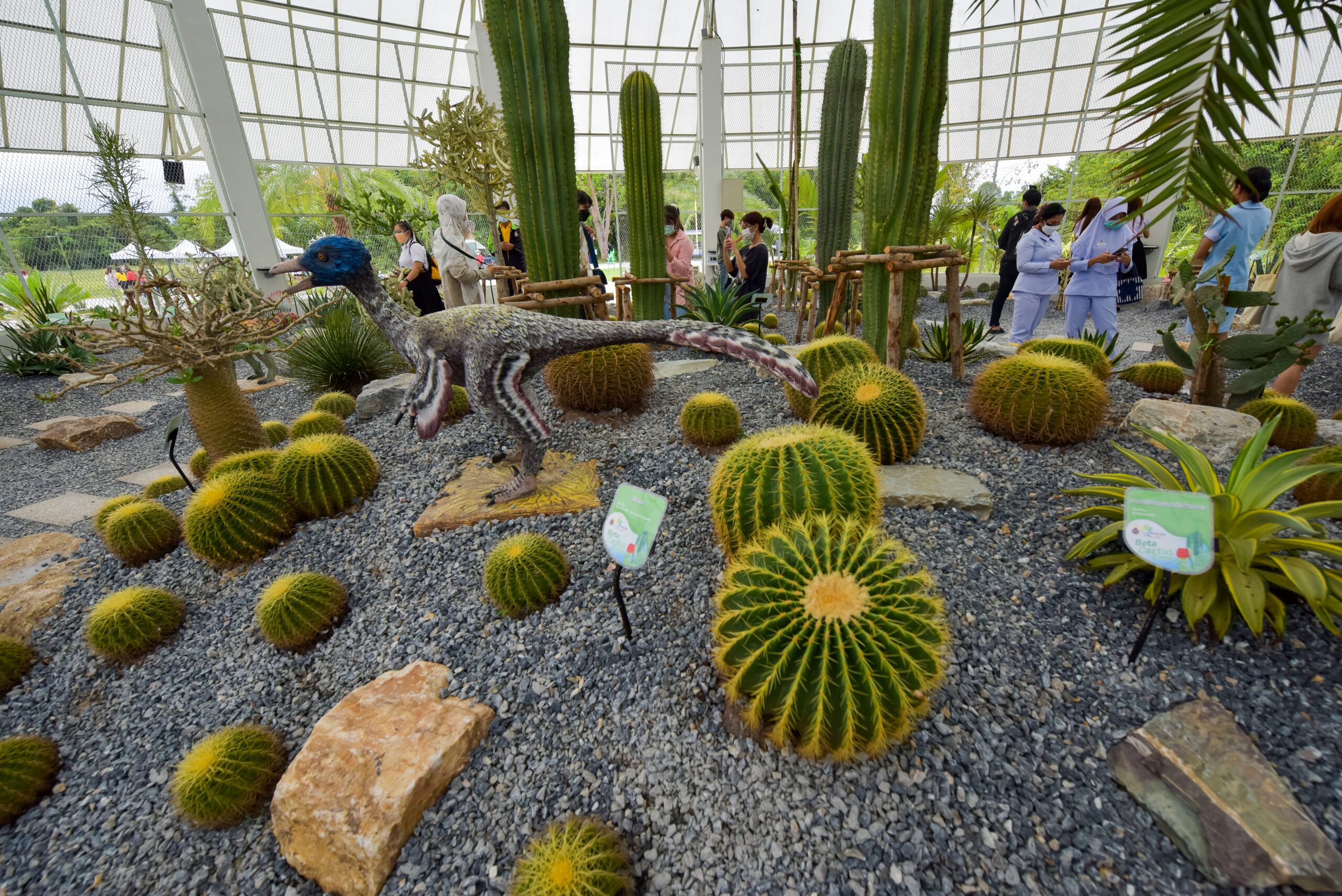 The Bota Cactus Dome, the largest of its kind in Southern Thailand, houses an extensive collection of cactus species, drought-tolerant plants, and succulents, serving as an important botanical learning center for students and the general public. The dome features 22 cactus species, 3 succulent species, and 12 drought-tolerant species, totaling 220 plants. Additionally, Nong Nooch Tropical Garden, through the generosity of Mr. Kampol Tansajja, has donated further plant species, including 1 olive tree, 34 palm species, and 3 tamarind trees, totaling 106 plants. This diverse array of drought-resistant and rare species enhances the botanical collection, adding both educational value and aesthetic harmony to the Bota Cactus Dome, making it a prominent botanical center in Southern Thailand.