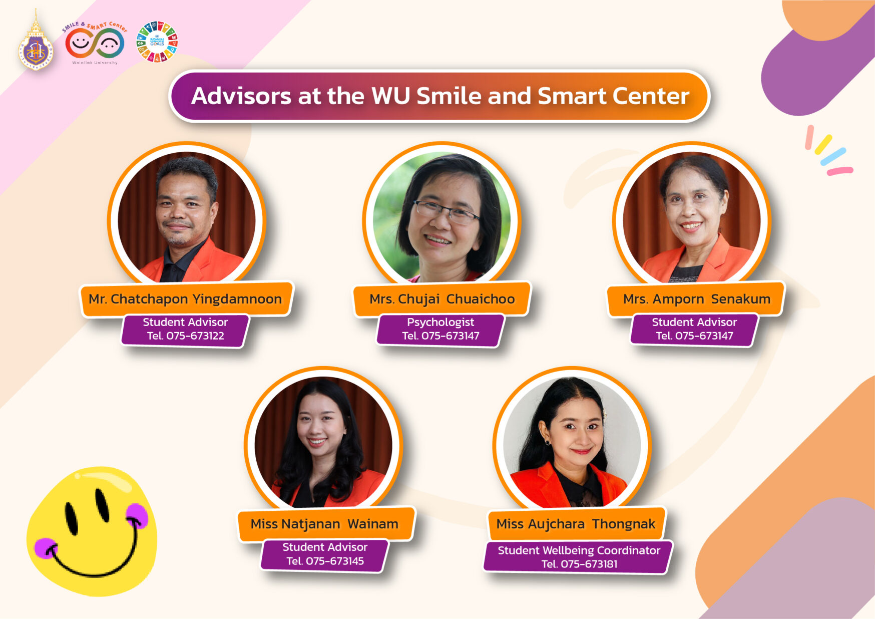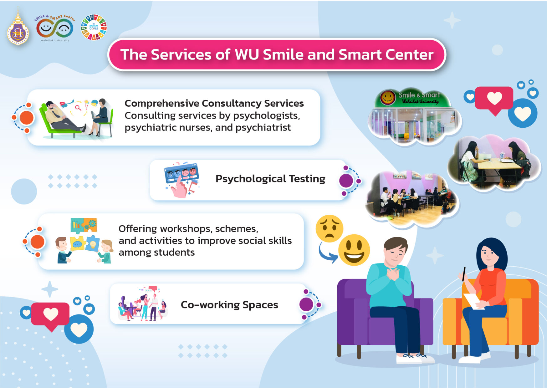 The Smile and Smart Center, part of the Division of Student Support and Development at Walailak University, plays a vital role in supporting female students through mentorship, academic guidance, and personal development programs. The center provides tailored support for students dealing with stress, depression, anxiety, or personal challenges, ensuring they have access to the right resources for a positive university experience. With a dedicated team of advisors and a psychologist, the center offers comprehensive assistance, addressing concerns related to academic performance, family issues, mental health, and social adjustment.