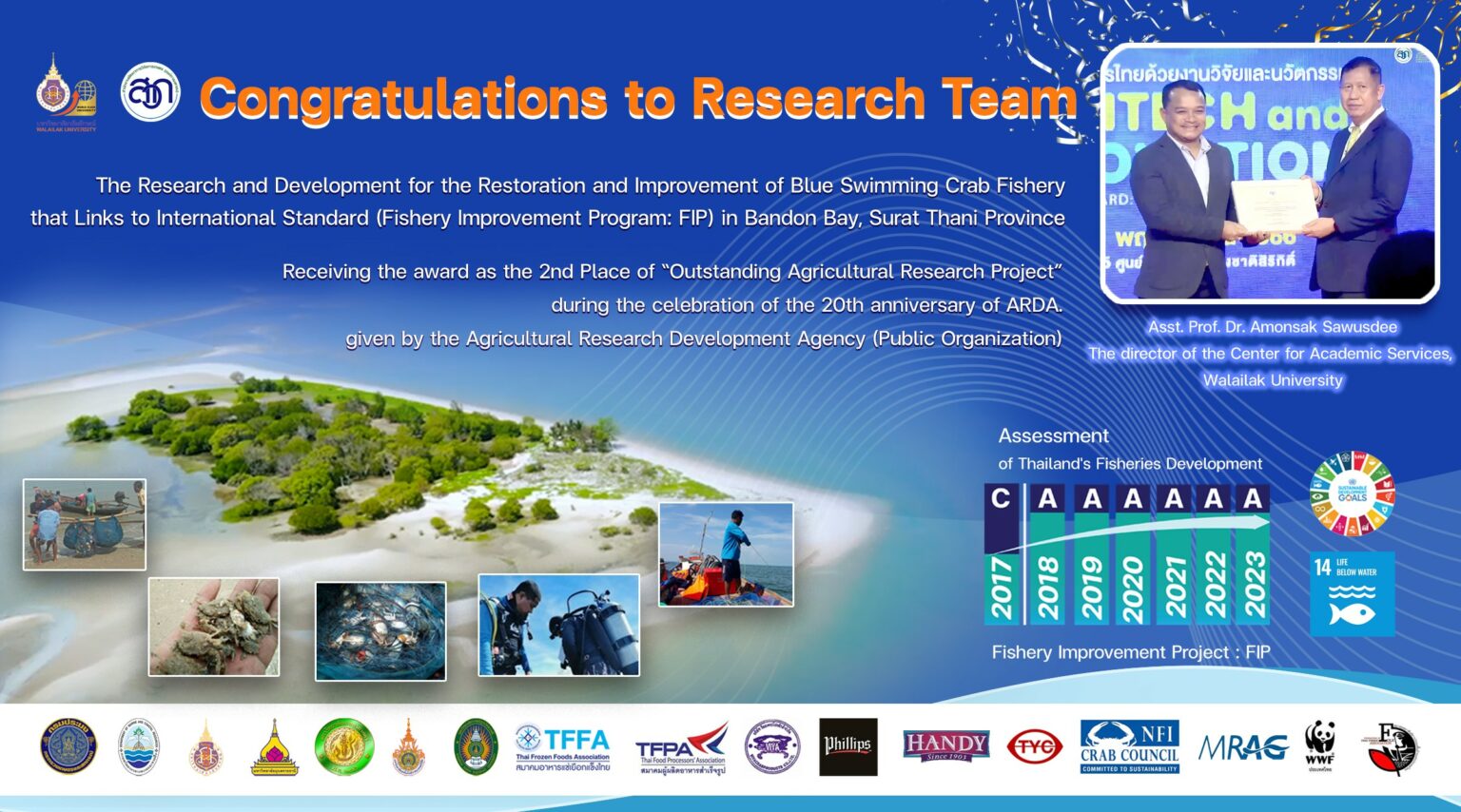 Led by Asst. Prof. Dr. Amonsak Sawusdee, CAS Director, the project achieved significant milestones, including elevating the FIP rating from C level in 2017 to A level from 2018 to 2024. This accomplishment reflects enhanced sustainability and management practices in Thailand’s blue swimming crab fisheries. Dr. Amonsak received the recognition on behalf of his team from Mr. Chavalit Chookajorn, Chairman of the Board Committees of the Agricultural Research Development Agency (ARDA), during the agency’s 20th-anniversary celebration held on November 21, 2023, at Exhibition Hall 5 of the Queen Sirikit National Convention Center (QSNCC). Themed “AgriTech and Innovation: Moving Forward from Local to Global,” the event included a conference and research showcase that featured leading agricultural innovations.
