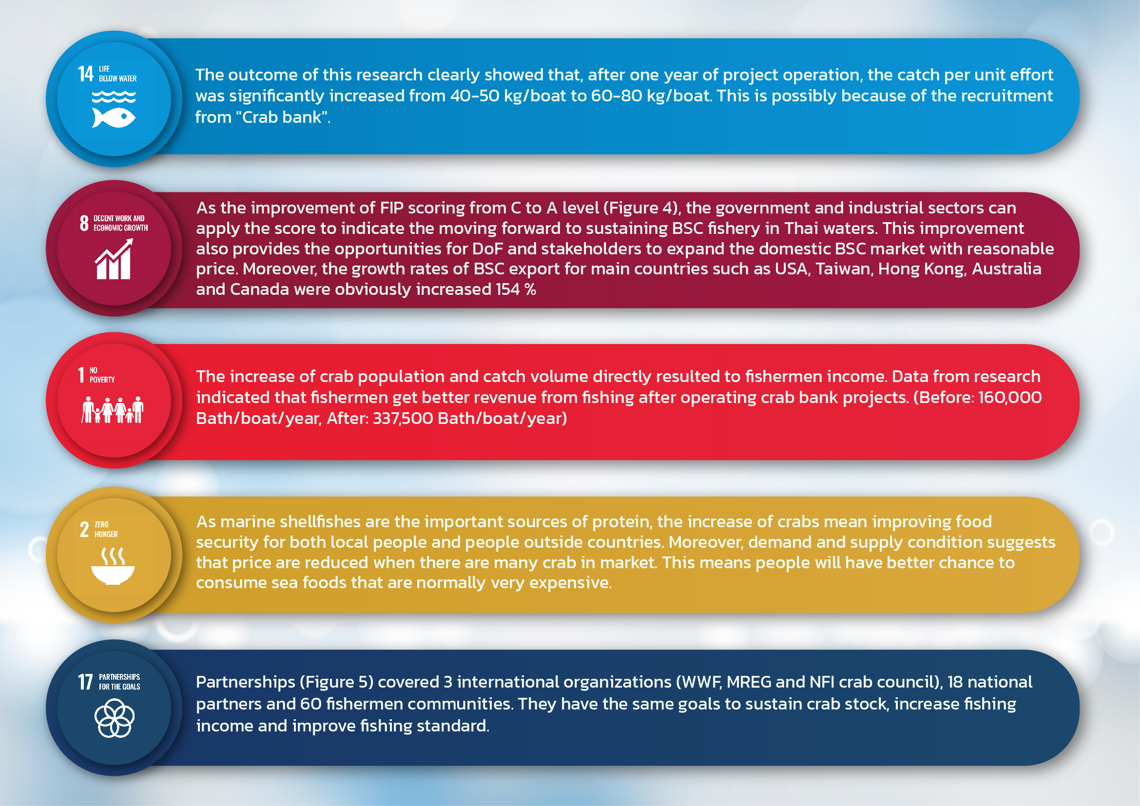 The “Crab Bank” program, launched by WU, is a community-driven project designed to address social needs, foster partnerships, and enhance stakeholder involvement. Supported by the National Research Council of Thailand, the Agricultural Research Development Agency, and the Ministry of Science and Technology, the Crab Bank project involves collecting gravid female crabs, allowing them to spawn, and then releasing young crabs back into the ocean. Alongside this initiative, WU conducts scientific studies to monitor BSC populations, assess fishing habitats, and address related environmental concerns. WU collaborates with both local community and international organizations, including Thai universities, the NFI Crab Council (USA), the World Wildlife Fund, and the Marine Resources Assessment Group (MRAG), focusing especially on Bandon Bay, the largest BSC fishing area in the Gulf of Thailand.