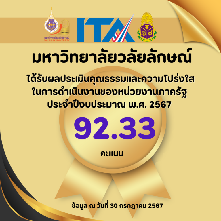 Walailak University has successfully passed the Integrity and Transparency Assessment (ITA) for the fiscal year 2024 with a score of 92.33. The evaluation comprises three key components:
