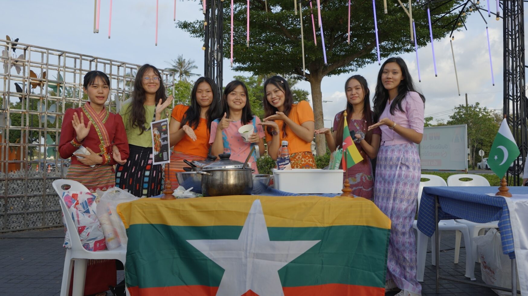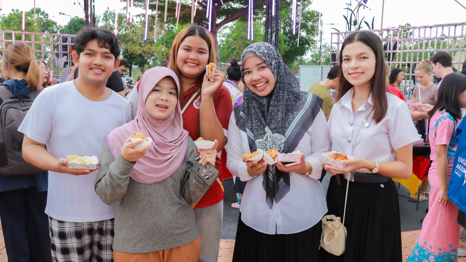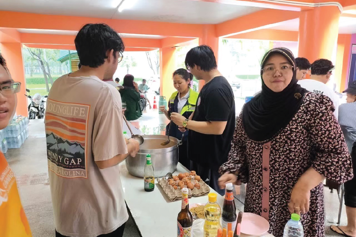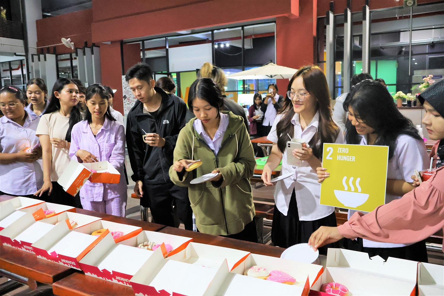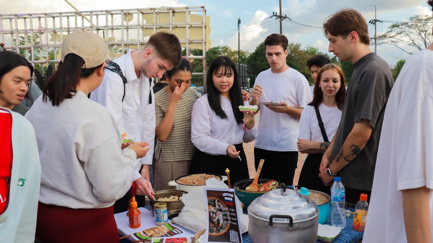 Moreover, the Center for International Affairs provided interventions to prevent or alleviate hunger through International Food Festival for staff and students at Botanic Park to provide food support for both Thai and international students, aiming to reduce food insecurity within the university, and to promote access to a diverse range of meals for students and staff — including halal, vegan, and vegetarian options. The event featured an international food presentation showcasing both savory and sweet dishes prepared by international students from nine countries. These included Jollof rice and Chin Chin from Nigeria, fried vegetables and herbal drinks from Indonesia, pesto pasta salad from Germany, apple charlotte, candied berries, potato and buckwheat dumplings from Russia, gyoza from China, Shan noodles from Myanmar, kimbap and tteokbokki from Korea, as well as Pakistani tea and Thai cotton candy.