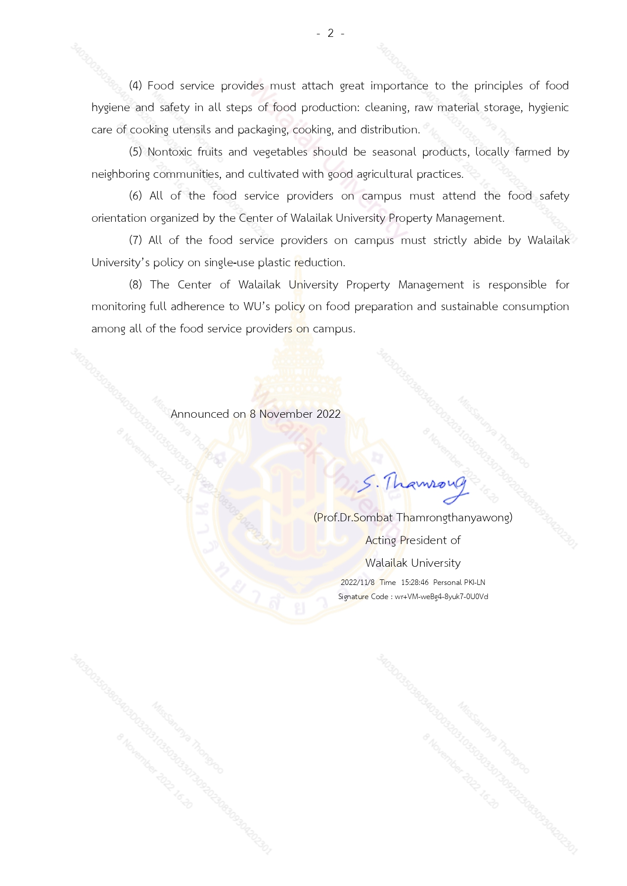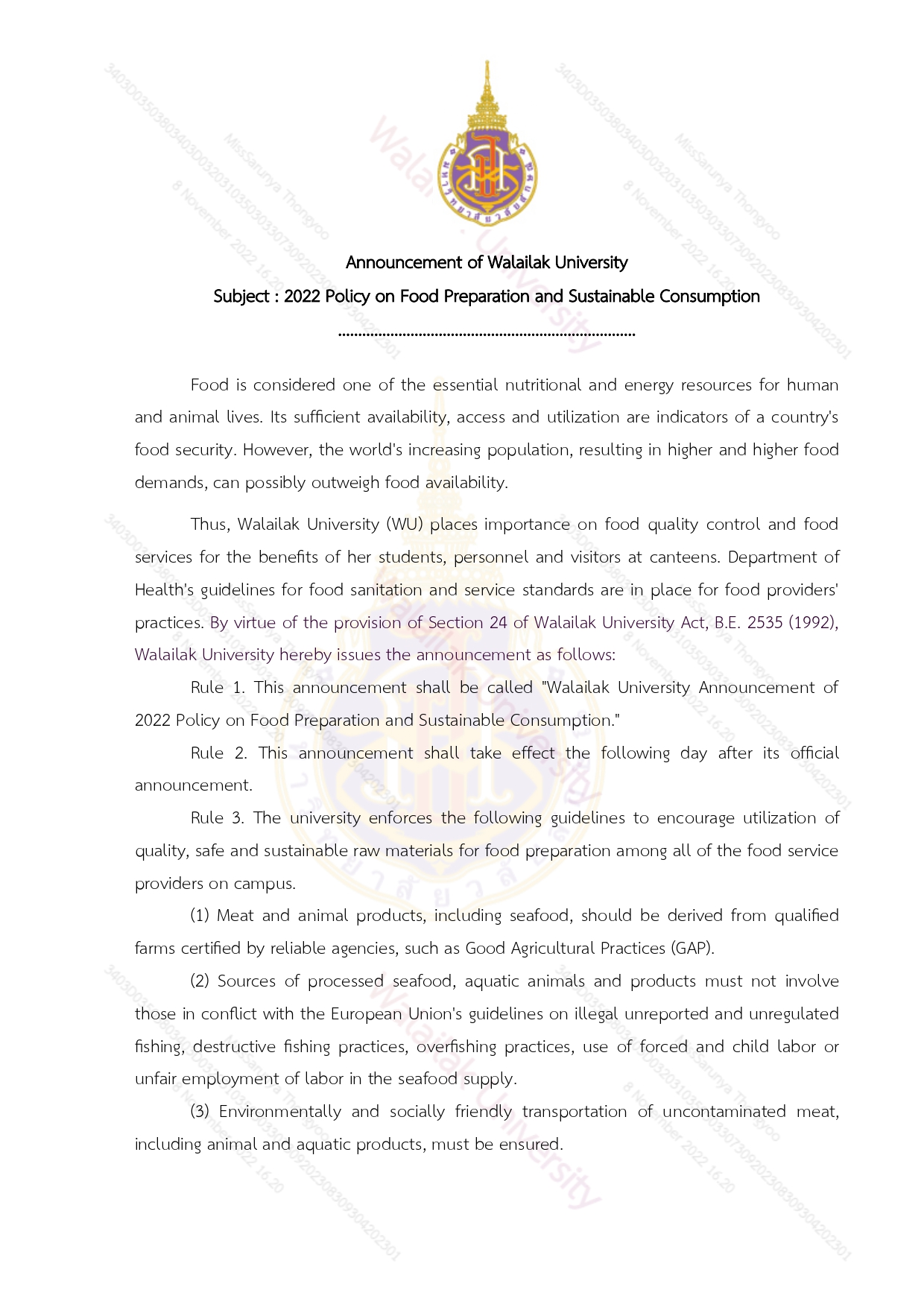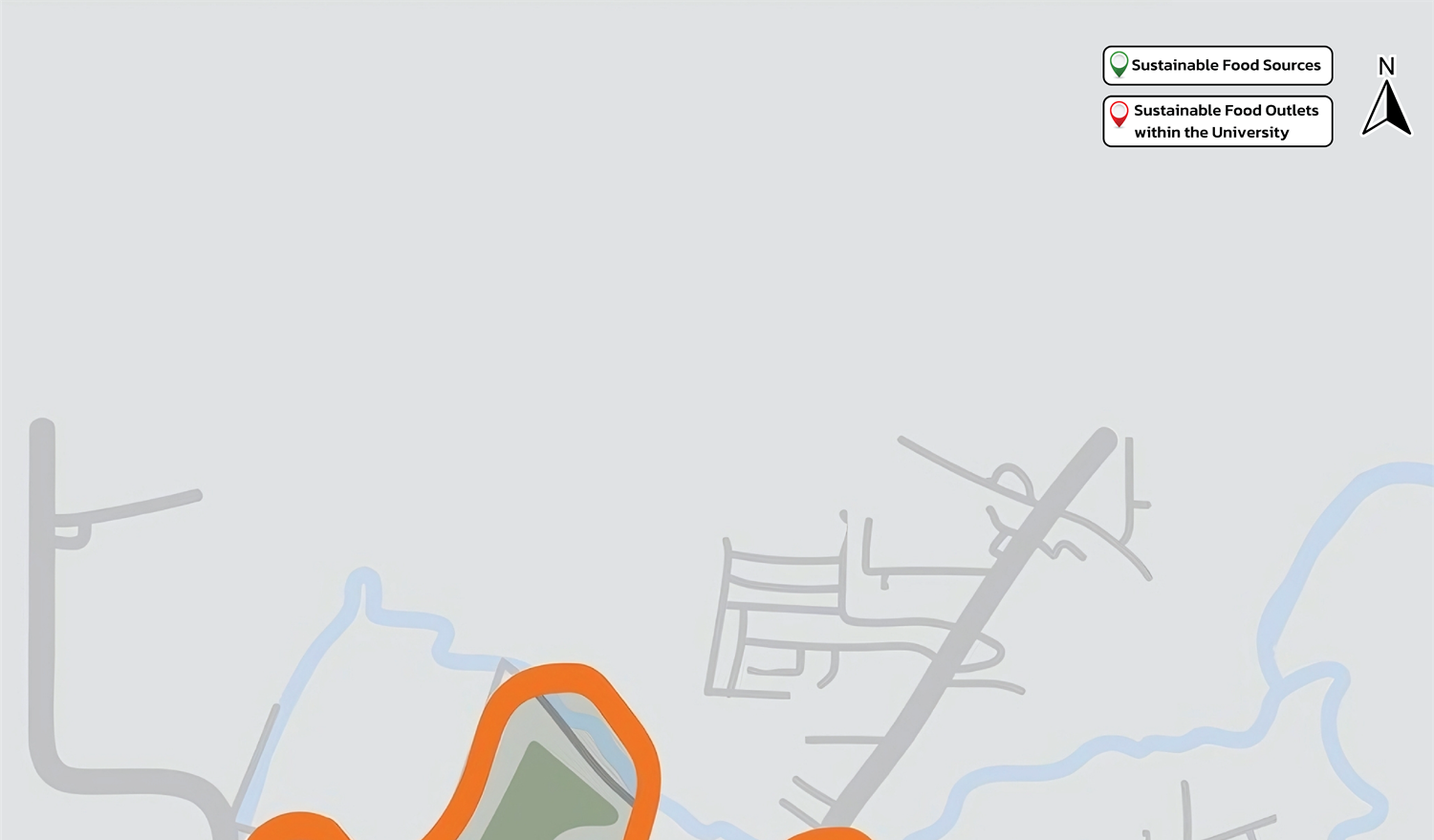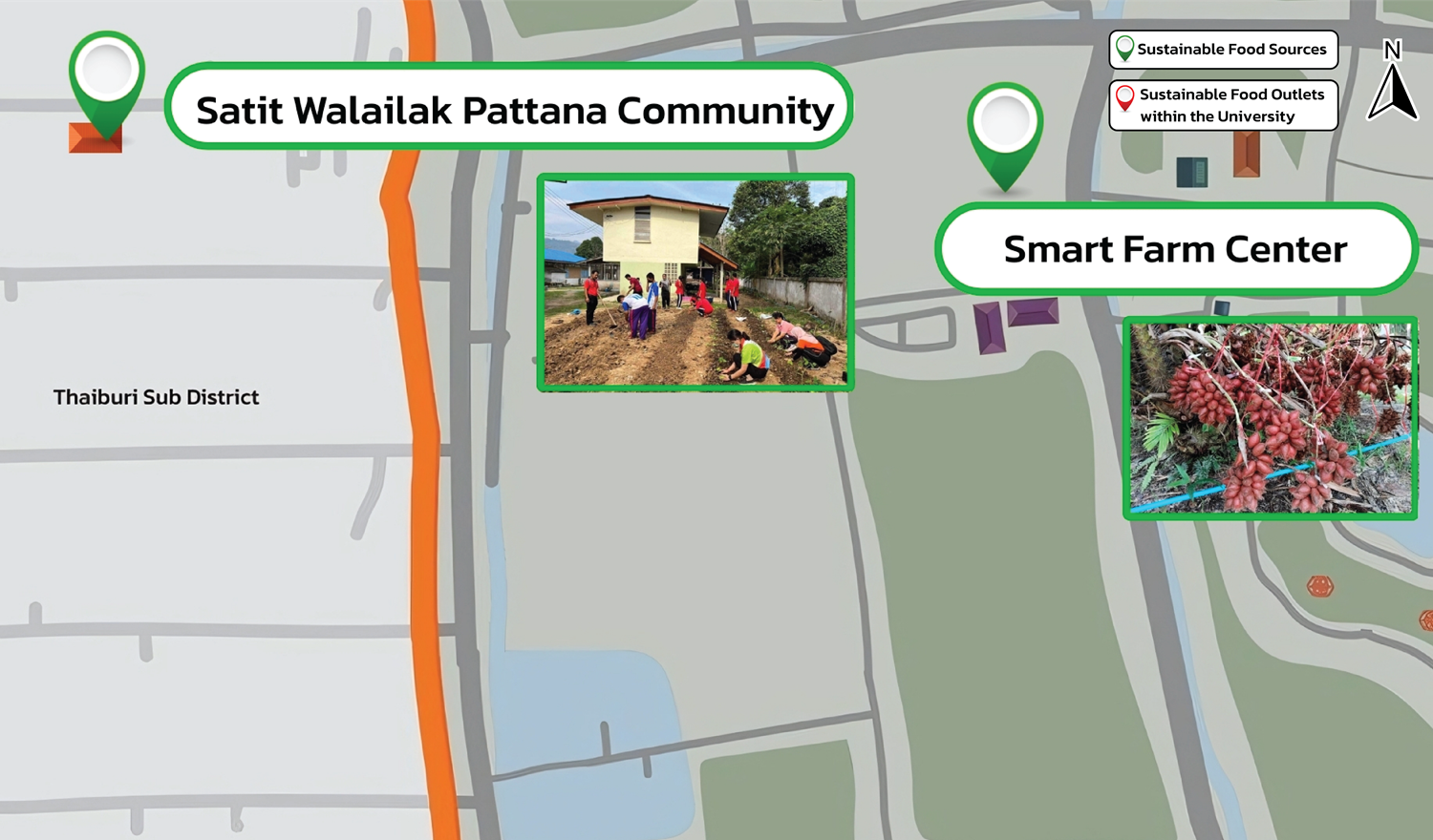 At Walailak University, food sustainability is deeply connected to sourcing safe, healthy, and environmentally responsible food from local communities. The university prioritizes purchasing from sustainable food sources that emphasize the responsible management of land and natural resources. It supports environmentally friendly production methods, such as utilizing seasonal ingredients to reduce the environmental impact of transportation. Furthermore, the university encourages restaurants and food suppliers that focus on minimizing food waste, aligning its efforts with the United Nations Sustainable Development Goals (SDGs) on responsible consumption and the sustainable management of food resources.