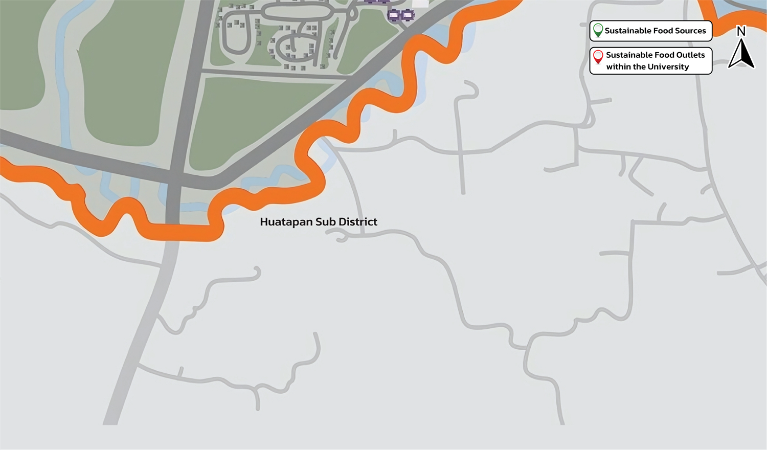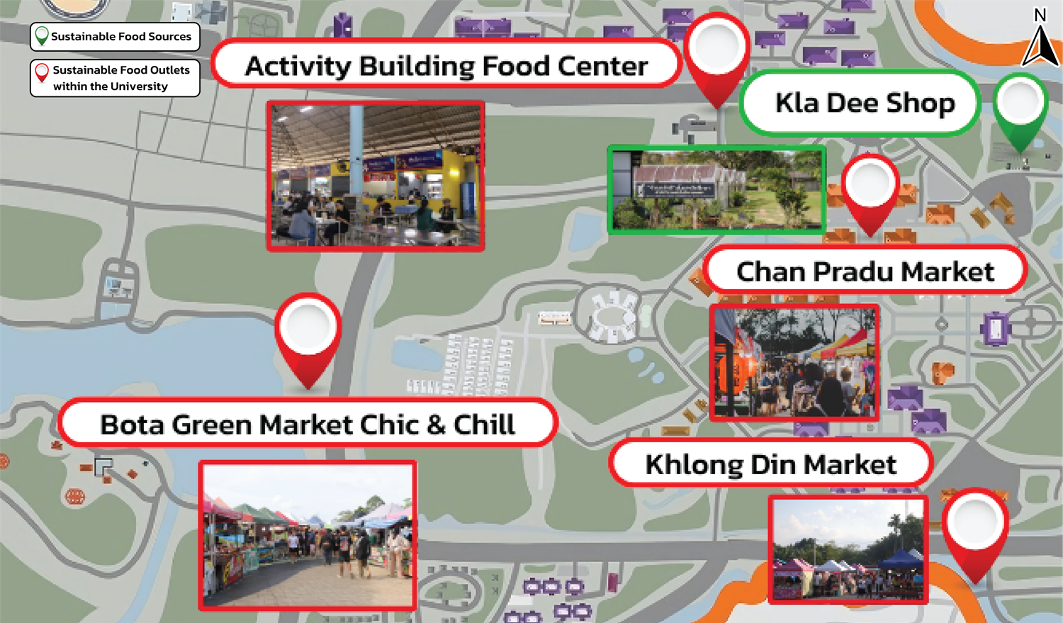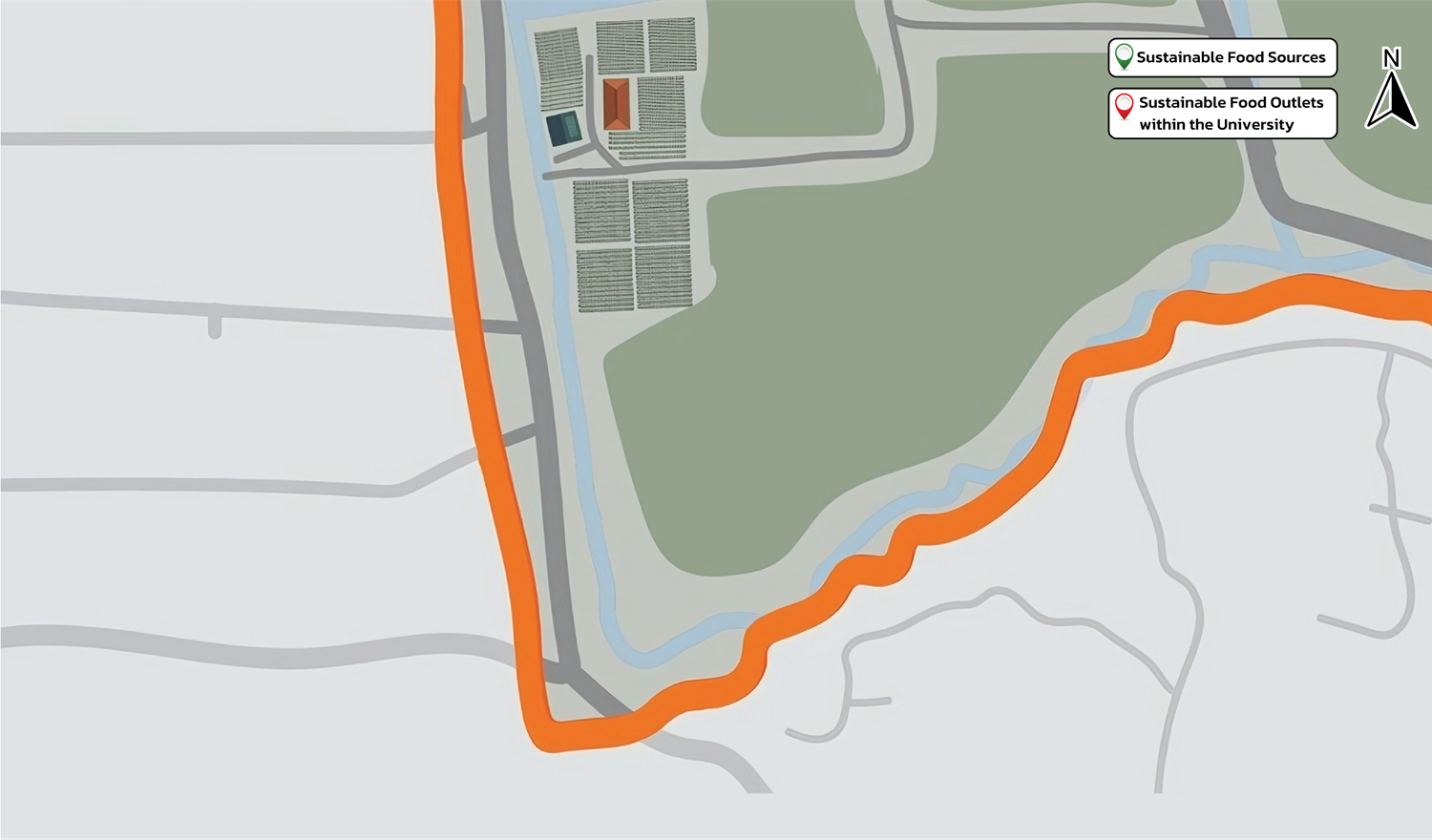 Therefore, the selection criteria for restaurants and vendors within the campus highlight businesses located within 1–2 kilometers, particularly those from Satit Walailak Pattana Community. This community supplies seasonal fruits, native vegetables, traditional desserts, and other products made from local ingredients. Currently, 94.17% of food vendors on campus are local community businesses, with only 5.83% being large-scale businesses from outside the community.