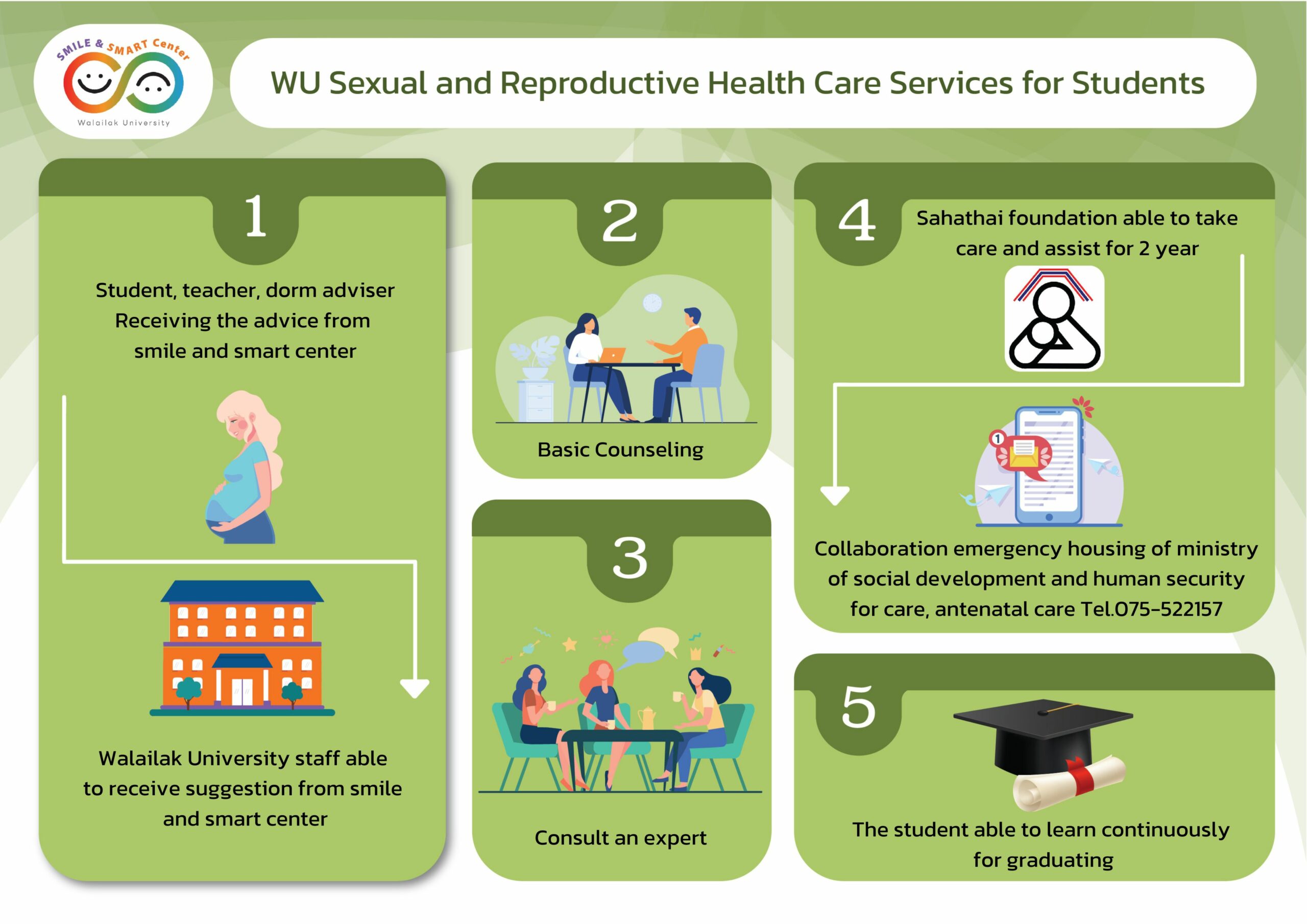 Sexual and reproductive health issues, particularly unintended pregnancies among adolescents, are critical concerns that require urgent and comprehensive solutions, especially among university students. Educational institutions play a crucial role in fostering an environment conducive to providing knowledge and services that sustainably prevent these issues. Consequently, WU provides students free access to sexual and reproductive health-care services including information and education services which are about sexual health services and safe pregnancy guidance, offering direct services to students to enhance their quality of life and reduce associated risks.
