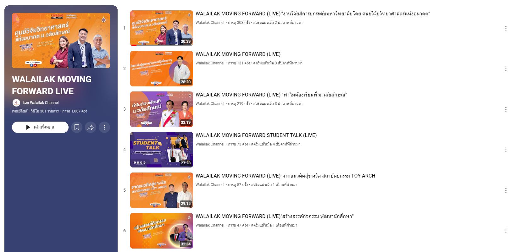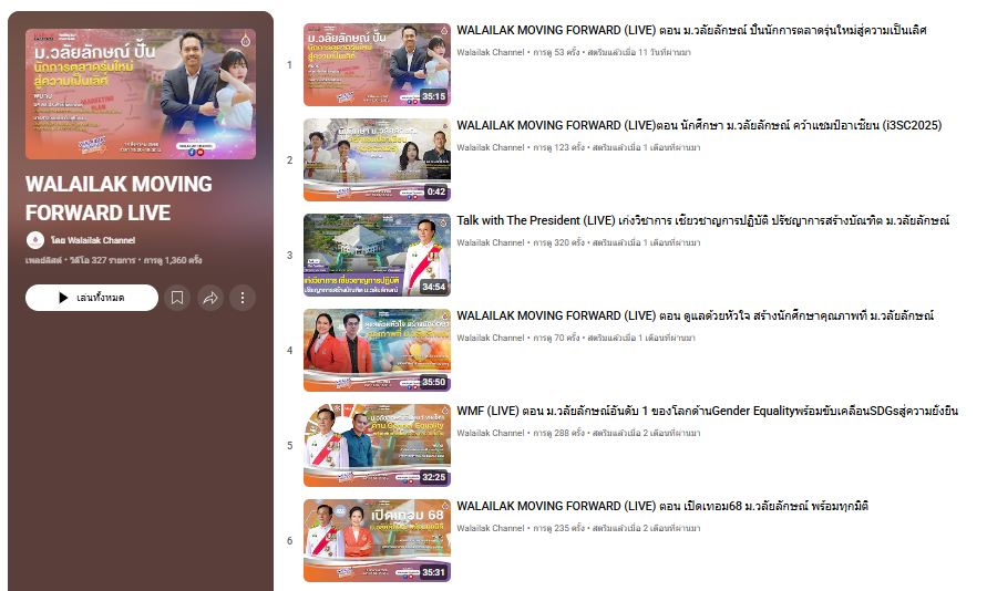 Figure : Walailak moving forward https://www.youtube.com/playlist?list=PLDCPf4m8RLTN2mJGS7p-pU9V_W1Kp6CT2