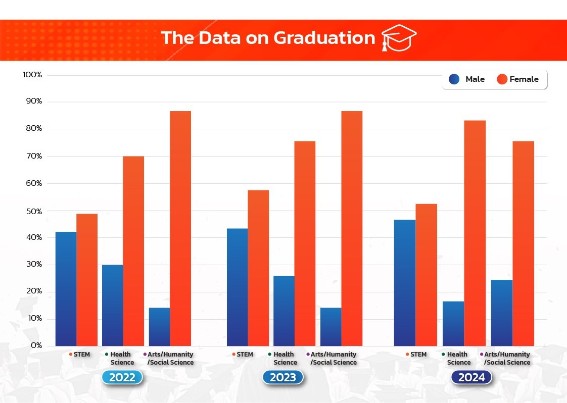 Graduation trends at Walailak University from 2022 to 2024 reveal a consistently higher proportion of female graduates compared to male graduates. In 2022, male graduates totaled 390 (26.13%), while female graduates were more than double, reaching 1,102 (73.87%). A similar pattern was observed in 2023, with males at 599 (27.48%) and females at 1,581 (72.52%). By 2024, the gender gap widened substantially, as male graduates dropped to only 127 (6.44%), whereas female graduates rose sharply to 1,846 (93.56%). These figures highlight the dominance of female students in graduation outcomes, with the disparity between genders becoming most pronounced in 2024. The data indicates that in 2024, the number of female graduates in Arts, Humanities, and Sciences, Health Sciences, and STEM exceeded that of male graduates. In STEM, the difference was modest, while in the other two fields, the number of female graduates was significantly higher.