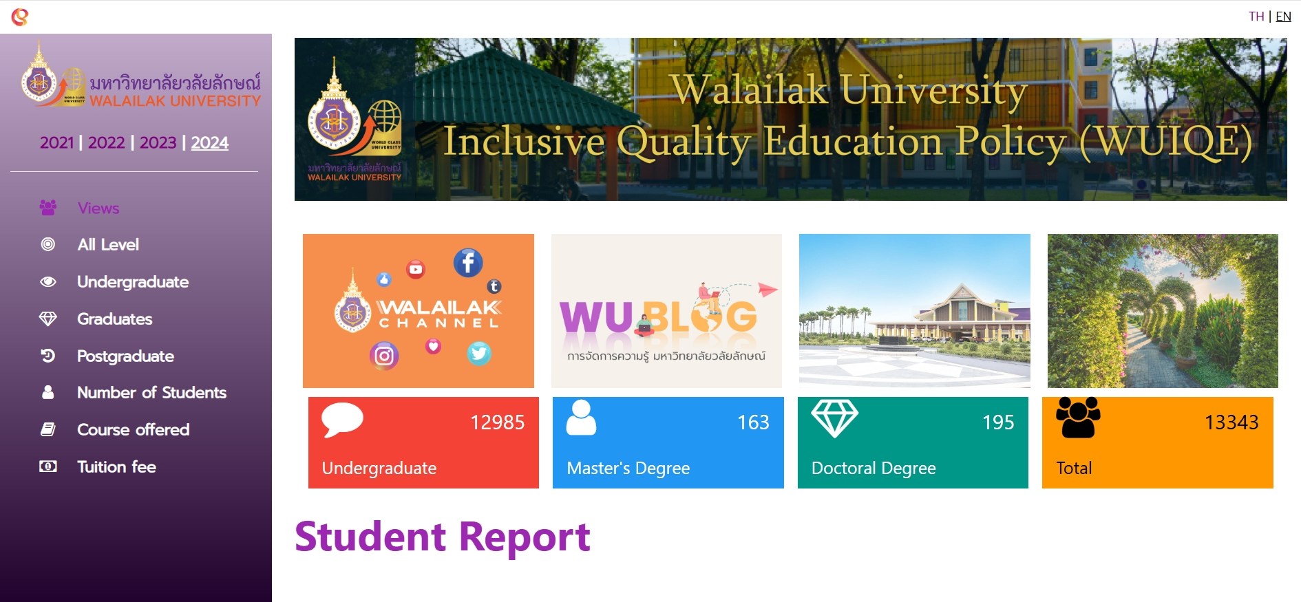The Walailak University Inclusive Quality Education Policy Website (WUIQE) is the website developed by the System Analysis and Information System Division, displaying numerical data, including the number of female graduates and total female students from 2021 – 2024. The website also tracks additional data related to SDG 5 and other SDGs. Each year, the CES publicly tracks and publishes the data on female graduates. This website allows for the CES for comparison with male graduates and provides transparency in tracking female students’ graduation rates. The CES staff can see the trends of the female student population, whether it increases or decreases, by comparing the data between 2021 – 2024. The WUIQE Website can be reached at https://ces.wu.ac.th/registrar/refer/sdg2.asp?d=&y=2567&lang=#designers