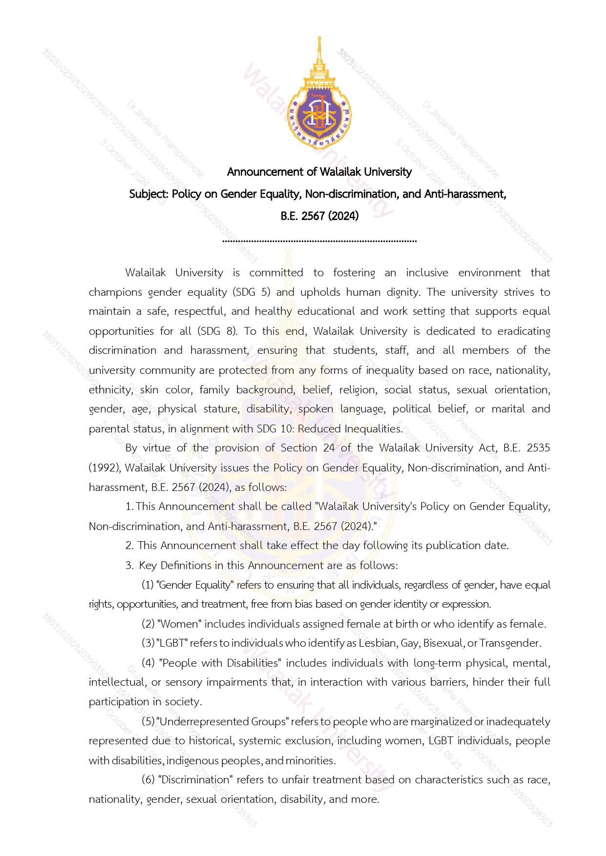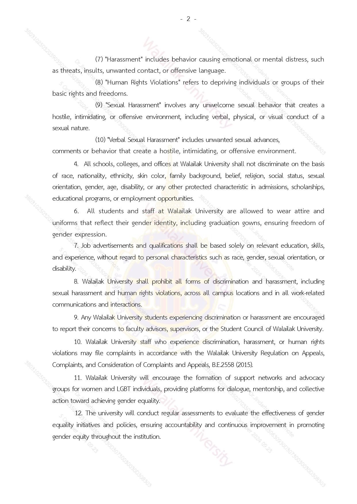 Walailak University is committed to promoting gender equality, where women, men, LGBT individuals, and others live in harmony and peace, free from any form of discrimination. In 2024, Walailak University issued a policy on Gender Equality, Non-discrimination, and Anti-harassment, B.E. 2567 (2024). The policy serves as a statement of Walailak University to demonstrate its commitment to gender equality.