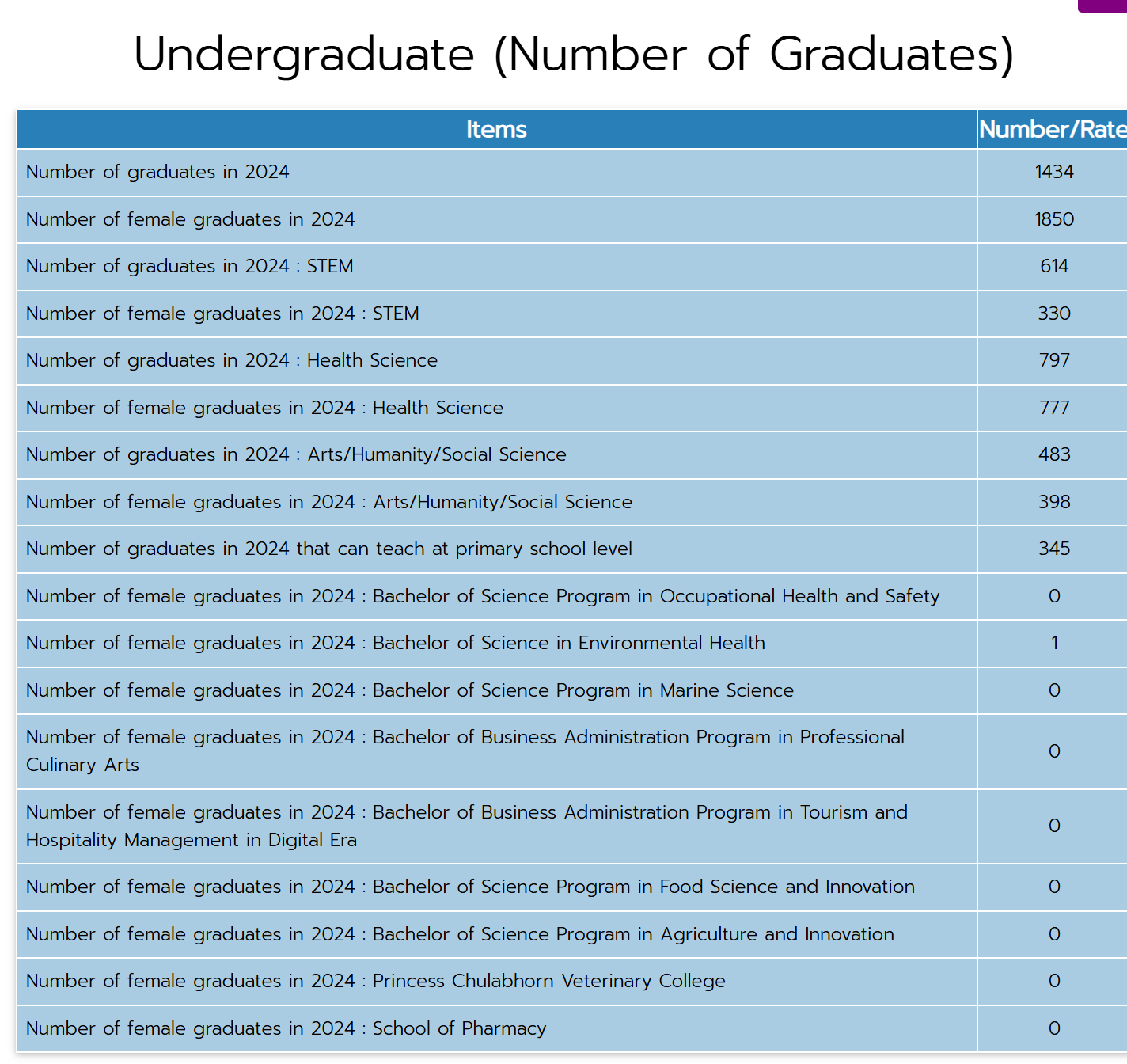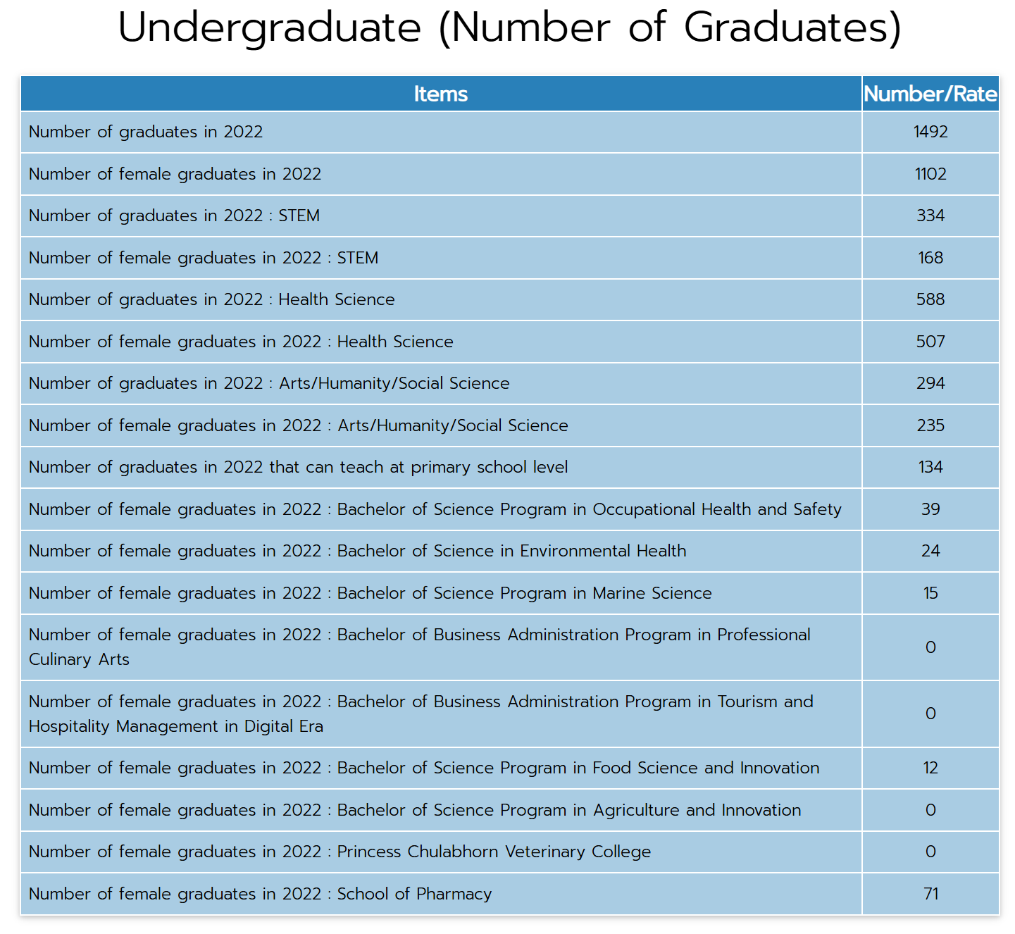 According to statistics collected by the Center for Educational Services (CES) over the past five years, the graduation rate of students at Walailak University is 97%, reflecting a high level of academic achievement across all programs. The consistently higher proportion of female graduates, particularly in Arts, Humanities, Health Sciences, and STEM fields, suggests both strong enrollment and retention of female students. This trend may indicate the university’s success in supporting female student participation and achievement. Additionally, the widening gender gap in 2024 highlights a potential area for further investigation, such as factors influencing male student graduation rates or program-specific enrollment patterns. Understanding these trends can help the university develop targeted strategies to ensure balanced opportunities and outcomes for all students in the future.