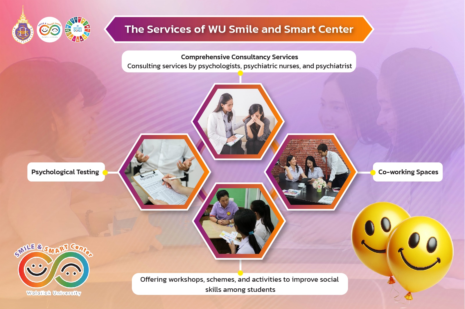 The center’s mentorship and counseling services not only support female students in overcoming these challenges but also empower them to remain actively engaged in their academic journey. This supportive environment encourages female students to thrive both academically and personally, reducing the likelihood of them leaving the university. By fostering a sense of belonging and resilience, the Smile and Smart Center helps close the gap in graduation rates, ensuring more female students complete their degrees and achieve their full potential. Female students can access mentoring services from the WU Smile and Smart Center by visiting the office or contacting them on Facebook at https://www.facebook.com/SmileSmartCenter