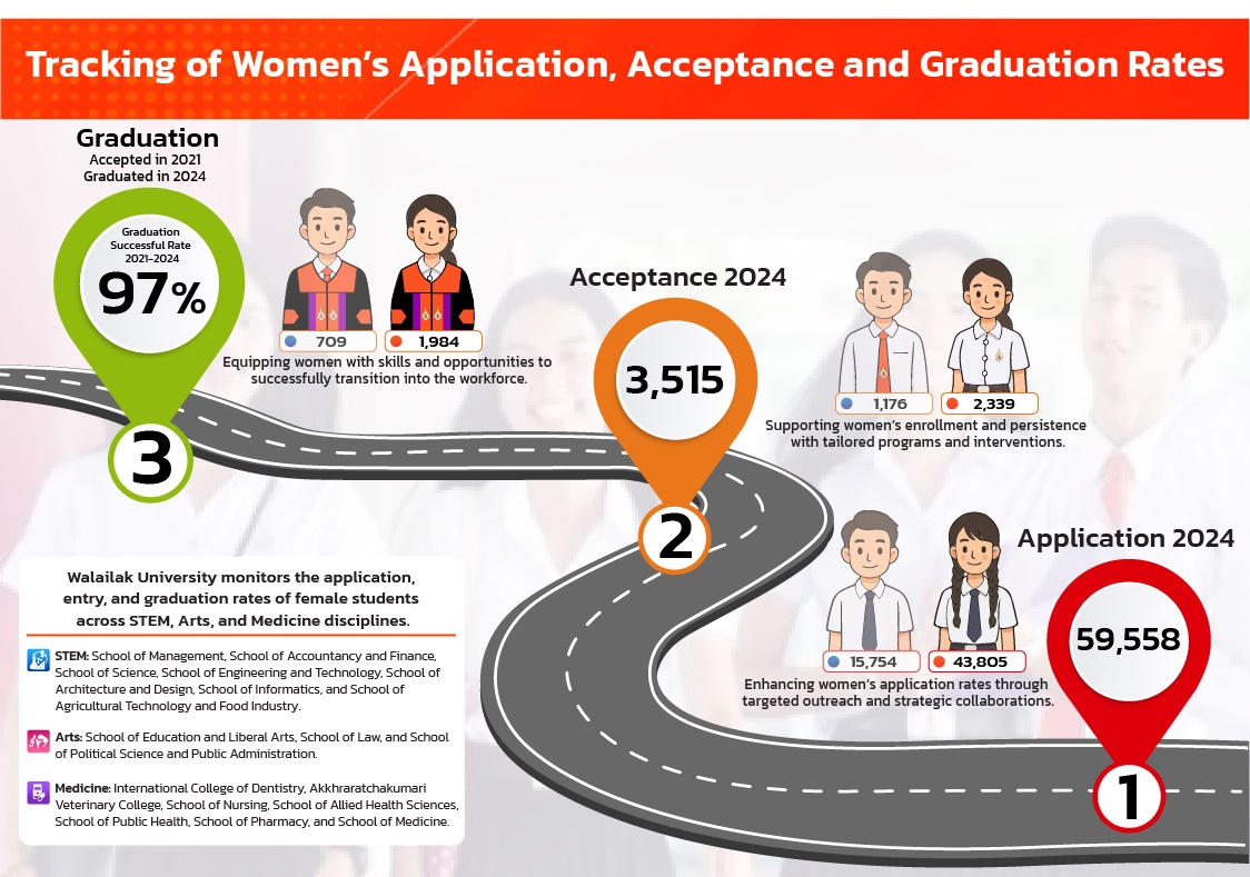 Walailak University has distinctive organizations that are responsible for measuring and tracking the graduation likelihood among female students and providing schemes in place to close any gaps.