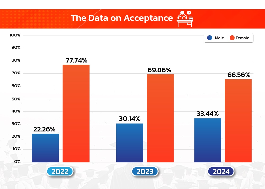 In 2022, female students represented a significant majority of accepted applicants at 77.74%, compared to 22.26% for male students. In 2023, the proportion of female acceptances decreased to 69.86%, while male acceptances increased to 30.14%, indicating a shift toward more balanced gender representation. By 2024, this trend continued, with female students accounting for 65.56% of accepted applicants and male students rising to 33.44%.