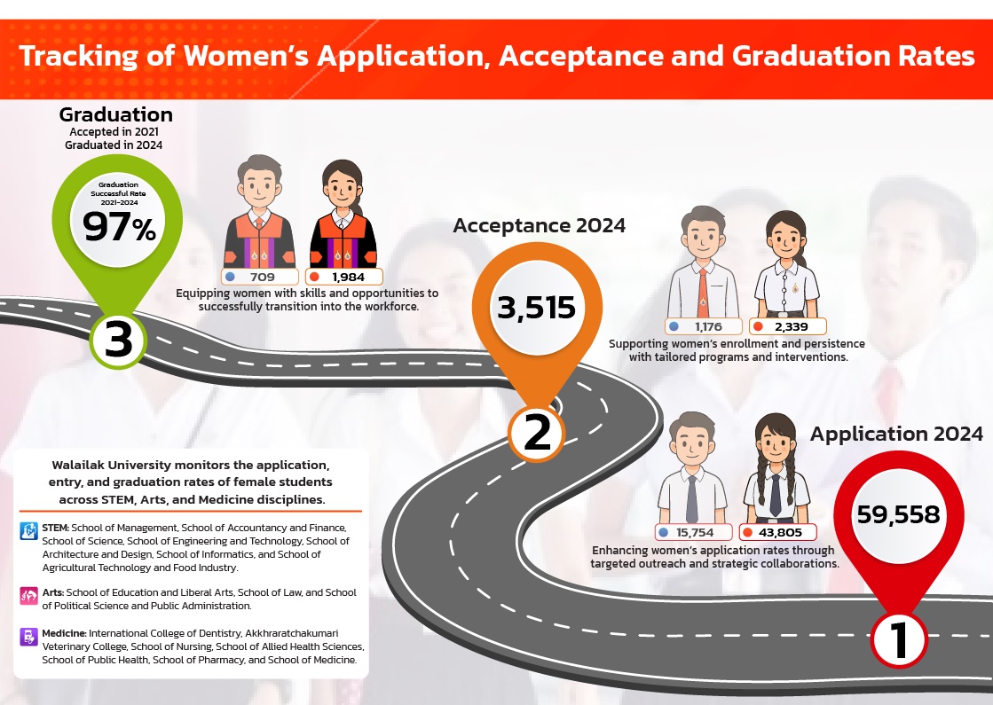 Walailak University affirms that women are never discriminated against in its admissions process, and the university upholds a strict principle of equal opportunity for all applicants, regardless of gender. Female students have long formed the majority of the student body, and this trend reflects the university’s inclusive environment, supportive academic culture, and gender-equitable practices. To ensure transparency and continuous improvement, Walailak University—through the Center for Educational Services (CES) and its Admission Division—systematically measures and tracks women’s application, acceptance, and entry rates every academic year. This rigorous monitoring system enables the university to identify trends, address potential barriers, and strengthen policies that promote women’s access to higher education across all disciplines, including STEM and Medicine. By maintaining a comprehensive and publicly accessible database on gender-related admission statistics, the university demonstrates its ongoing commitment to gender equality, women’s empowerment, and the advancement of fair and inclusive admissions practices.
