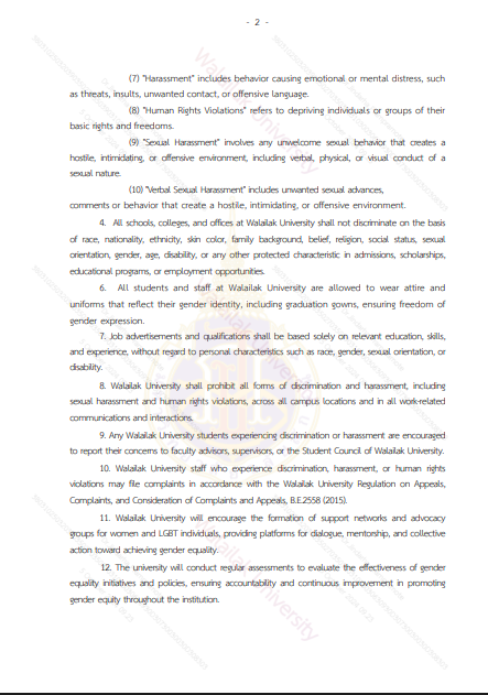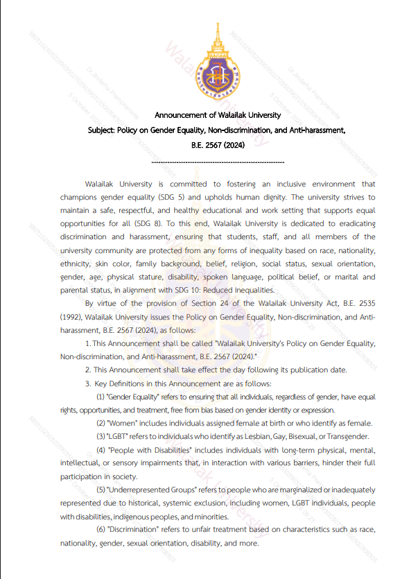Walailak University is firmly committed to advancing gender equity by actively addressing and conducting diagnostic analyses of women’s applications, admissions, and participation across all academic programs. To foster a more diverse and inclusive applicant pool, the university shall promote educational opportunities for women, with particular focus on disciplines where they have been historically underrepresented. Outreach programs, workshops, and targeted communications will be implemented to encourage and support women in pursuing higher education in any field.