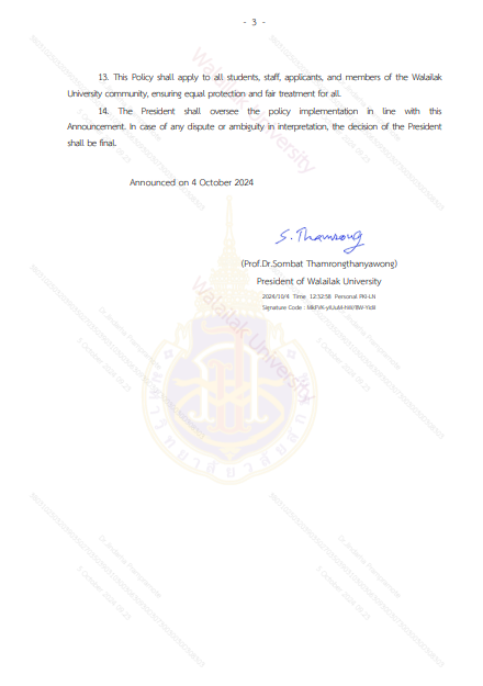 Beyond admissions, Walailak University is dedicated to providing a supportive environment that promotes women’s participation, well-being, and academic success. The university shall offer mentorship programs, academic resources, networking platforms, and establish organizations to empower women throughout their academic journey. Institutional policies will be regularly reviewed and enhanced to promote women’s academic, social, and leadership development, ensuring their continuous engagement and achievement. Through these initiatives, Walailak University reaffirms its commitment to cultivating an inclusive and empowering environment where women are encouraged to thrive and realize their full potential in every aspect of university life. In 2025, WU revised the Policy on Gender Equality, Non-discrimination, and Anti-harassment, B.E. 2568 (2025), as part of WU’s commitment to promoting a diverse community at WU.