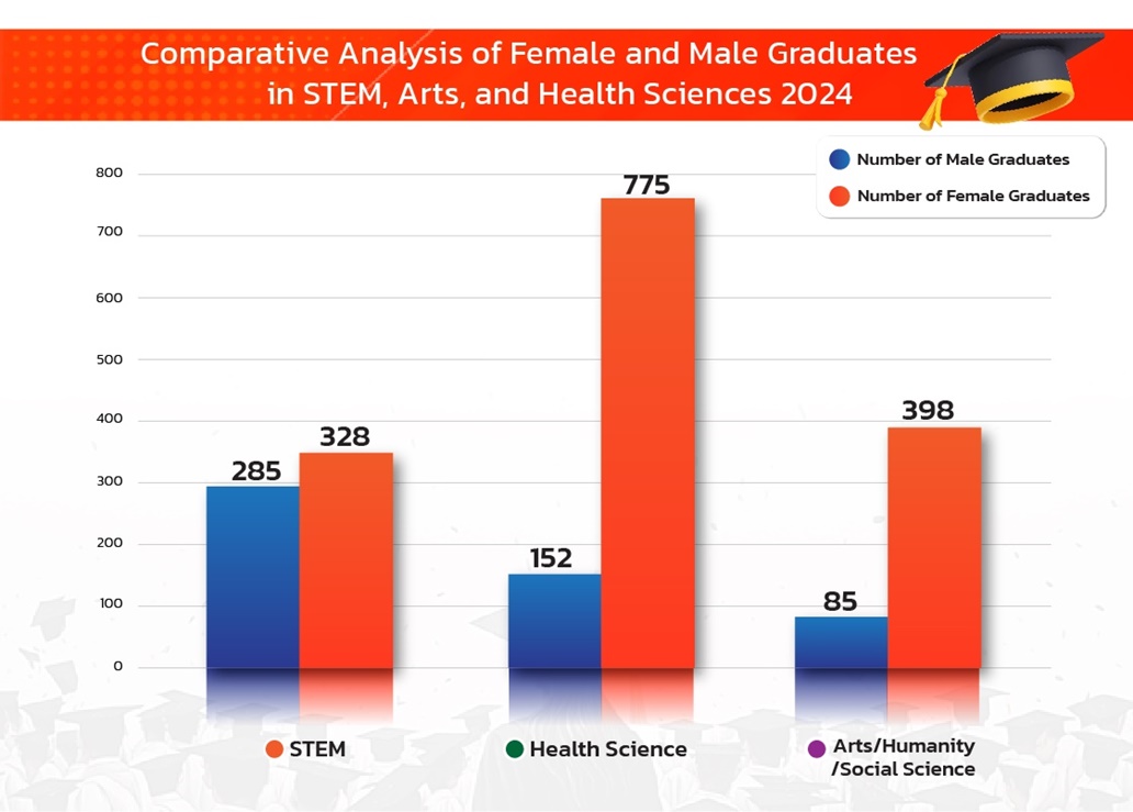 In 2024, Walailak University tracked the number of graduates across three academic fields: STEM, Health Sciences, and Arts/Humanities/Science. The results showed that Health Sciences produced the highest number of graduates. In all three fields, female graduates outnumbered their male counterparts. Specifically, in STEM, there were 613 graduates in total, with females exceeding males by 6.97%. In Health Sciences, there were 927 graduates, with females surpassing males by 67.21%. Meanwhile, in Arts/Humanities/Science, there were 483 graduates, with females outnumbering males by 64.80%.