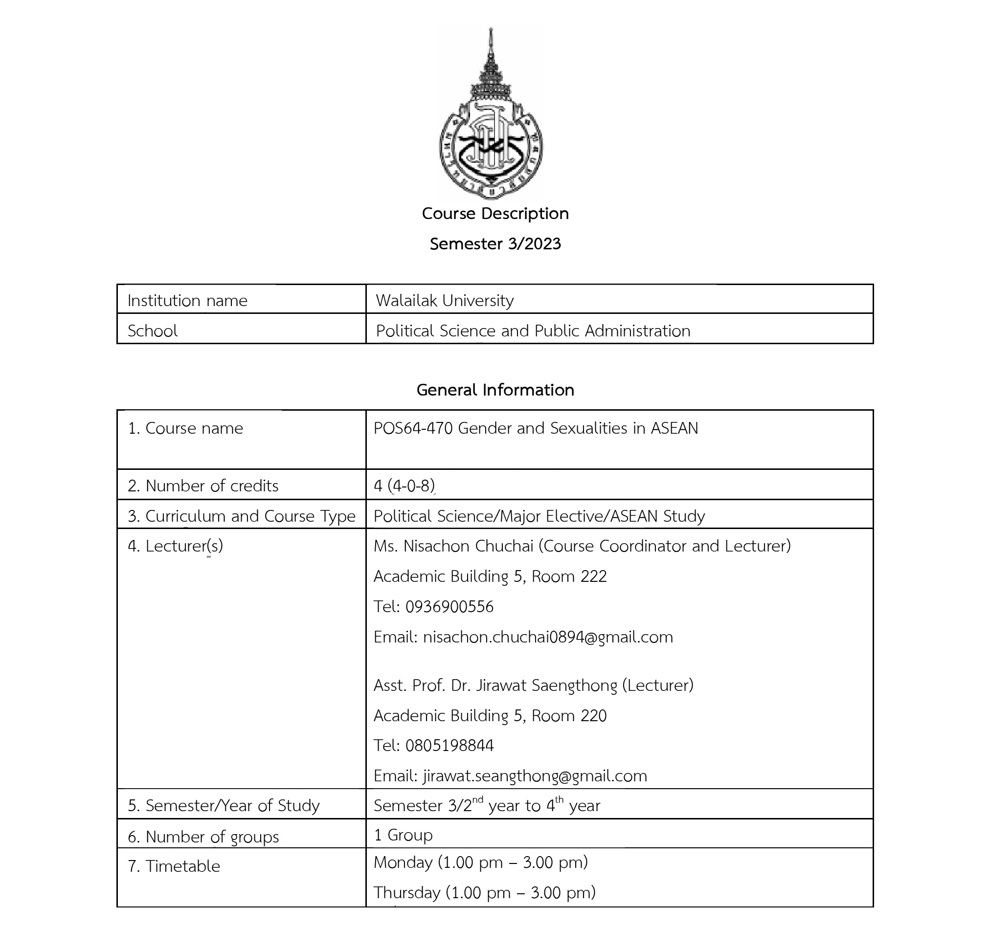 Walailak University has developed specific courses aiming to raise awareness about LGBT people among students to understand the life of lgbt people and respect them equally as male and female. The courses include: