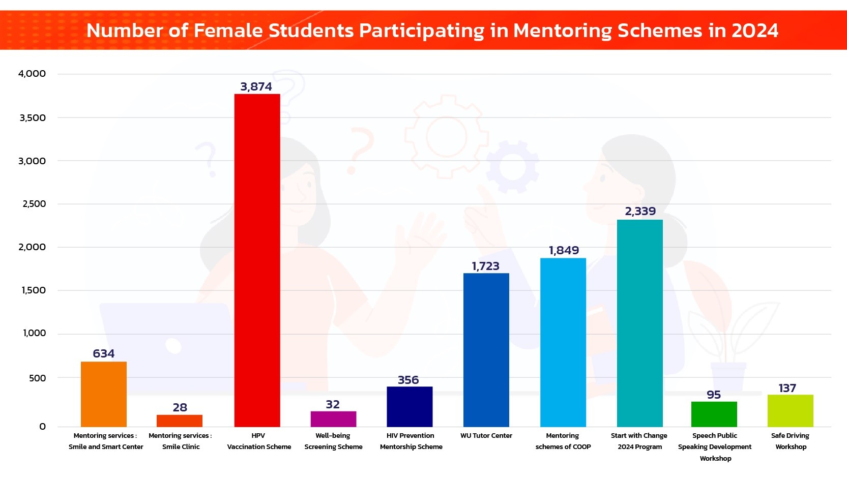 Based on the measurement of these diverse mentoring, health, and skill development programs, female students at Walailak University receive comprehensive support for their academic and personal growth. They receive guidance to navigate university life successfully, opportunities to enhance career readiness, training to improve public speaking and communication skills, and resources to maintain their physical, mental, and reproductive health. Programs such as the HPV Vaccination Scheme, Well-being Screening Scheme, and HIV Prevention Mentorship promote long-term wellness, while academic initiatives like the WU Tutor Center and career development workshops strengthen their knowledge and employability. Additionally, activities focused on road safety, self-confidence, and resilience equip them with practical life skills, ensuring they are empowered, well-prepared, and supported throughout their studies and beyond.