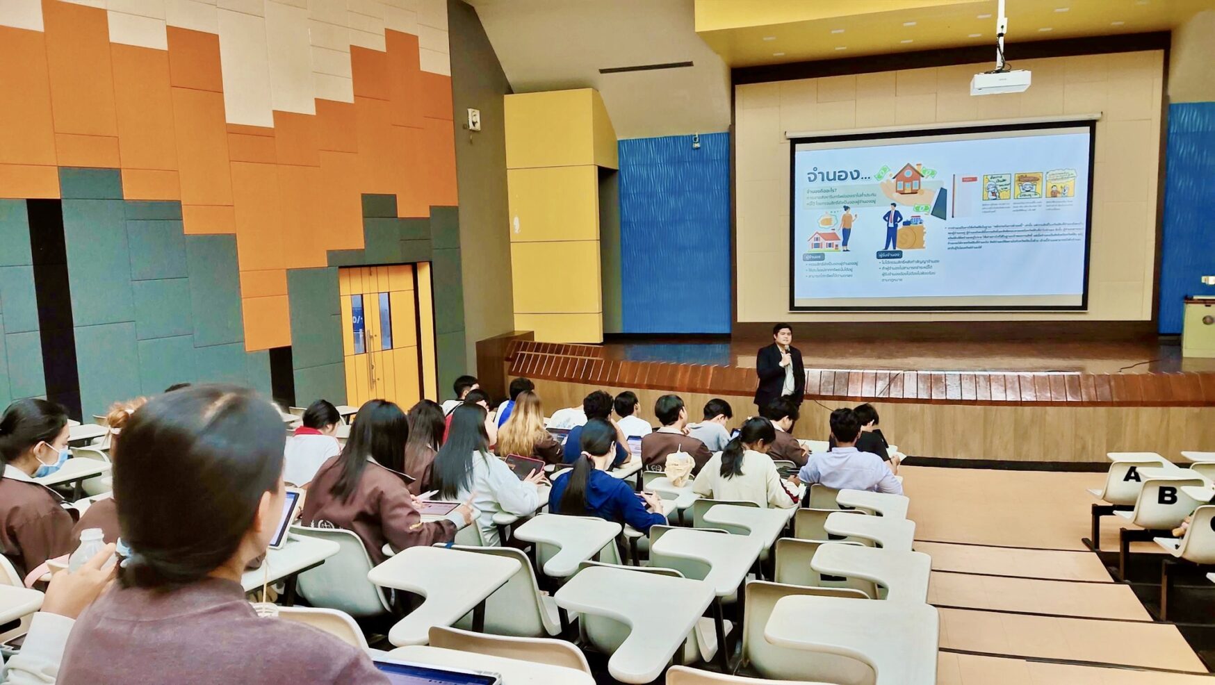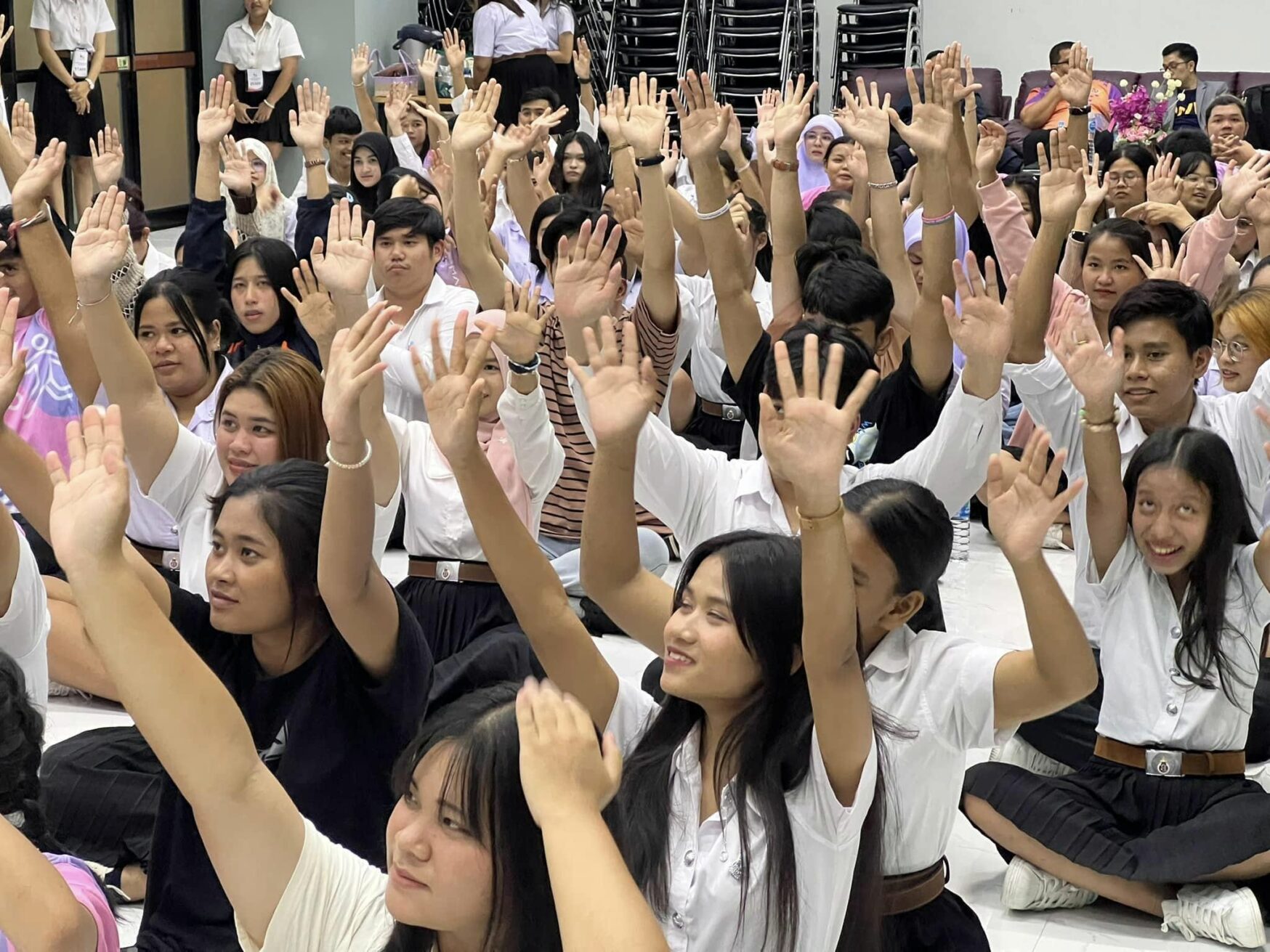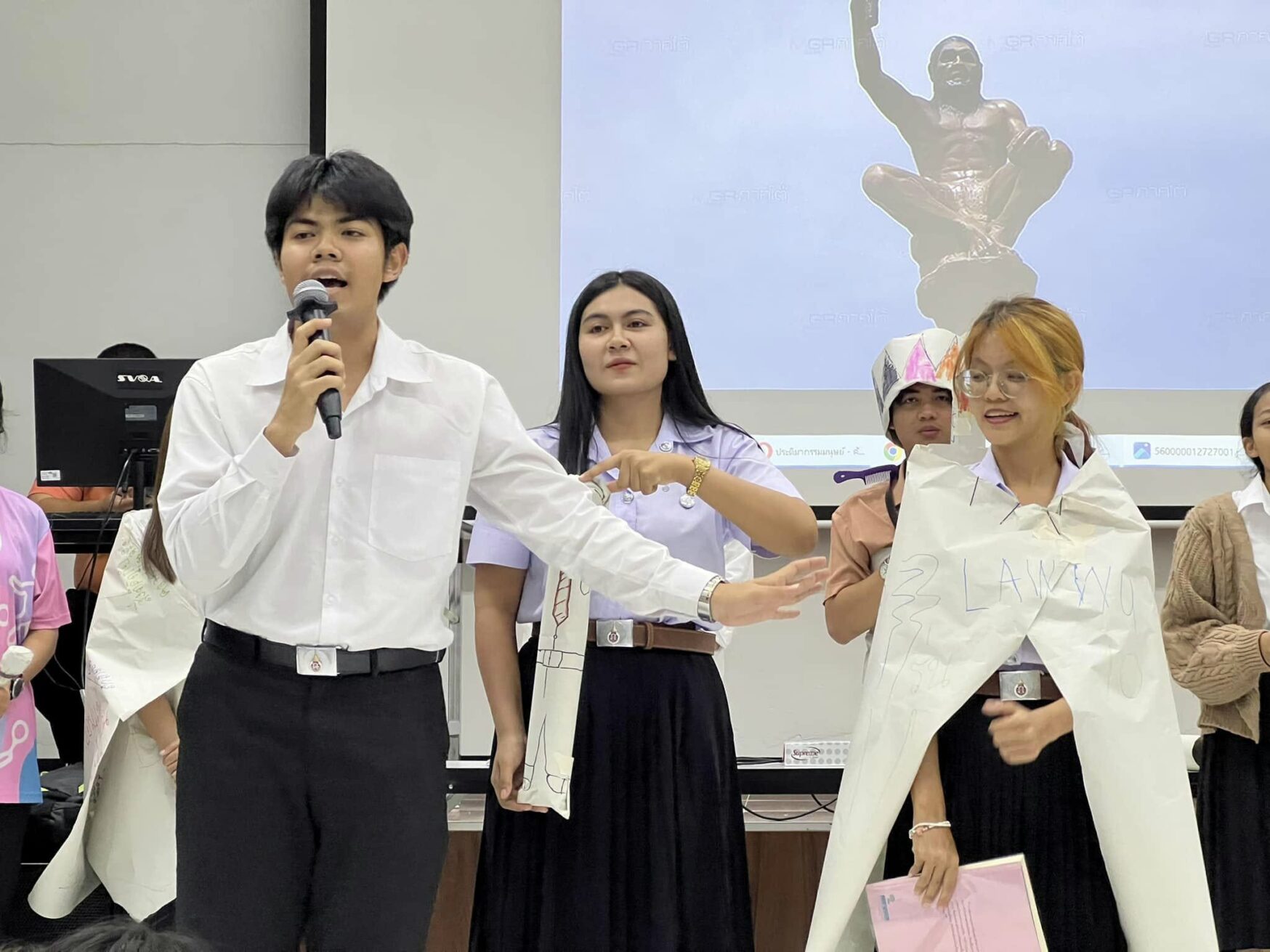 During the workshop, students engaged in interactive sessions where they learned essential public speaking techniques, including methods for managing nervousness, reducing anxiety, and improving fluency. Particular attention was given to practicing difficult-to-pronounce Thai words, helping students overcome linguistic challenges that can hinder clear and effective speech.