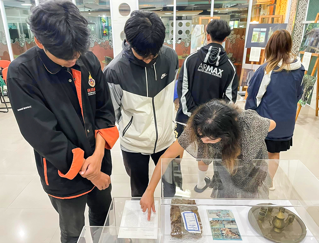 The exhibition area “The Artefacts: Nakhon Si Thammarat Nielloware” within the Thaiburi Building has been developed as a Cultural Heritage Learning Space for Sustainability, open to the public, staff, students, and interested visitors free of charge. The exhibition presents the history of nielloware, its production processes, pattern design, and the stories of local artisans, aiming to deepen understanding of traditional craftsmanship and contemporary approaches to preserving local arts.