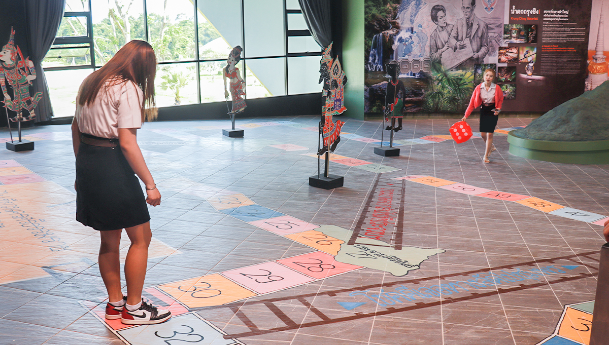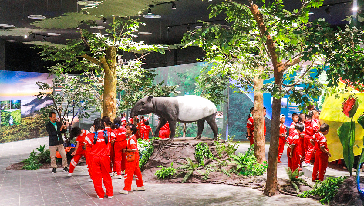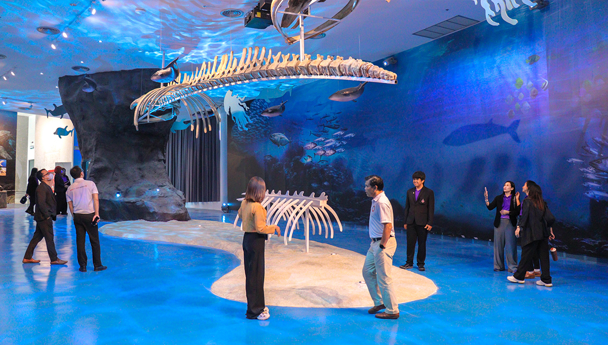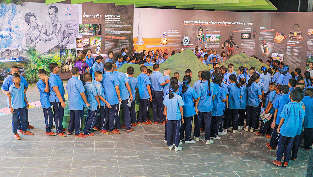 The museum’s design theme, “Following the Footsteps of the Princess, from Mountain Peaks to Under the Sea,” honors Her Royal Highness Princess Maha Chakri Sirindhorn. Located beside a scenic reservoir within Walailak University Botanic Park, with the Khao Luang mountain range as its backdrop, the museum features immersive exhibitions including replicas of the Krung Ching Waterfall and a simulated marine environment. These installations represent the rich and diverse ecosystems of Southern Thailand, from mountain rainforests to the coastal Gulf of Thailand.